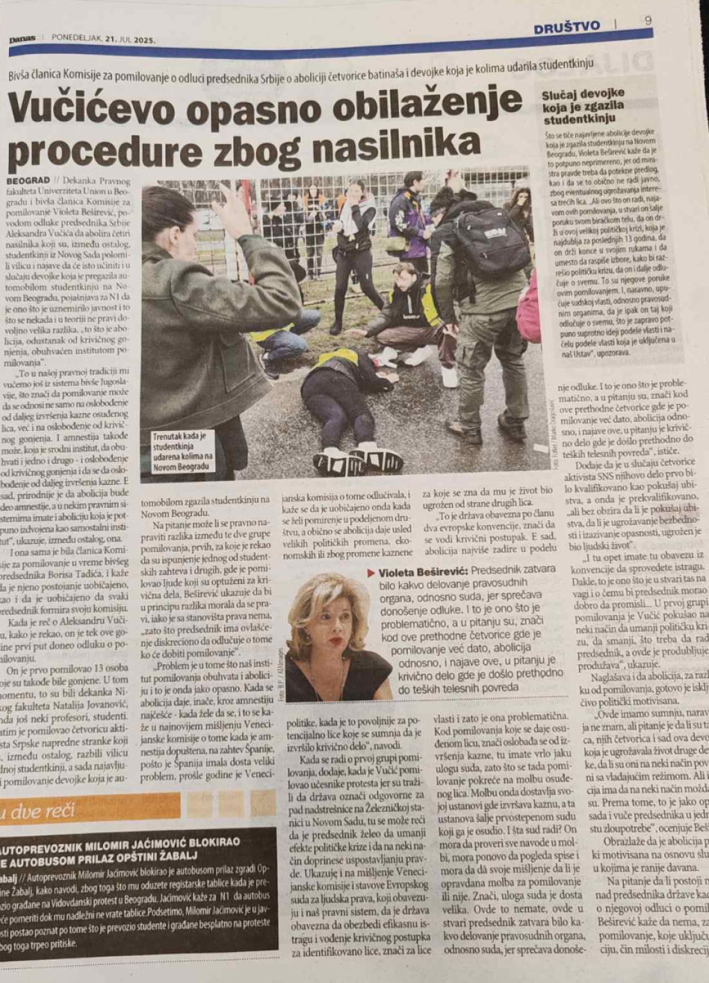 I strana devet je napad na Vučića kroz naslov "Vučićevo opasno obilaženje procedure zbog nasilnika".