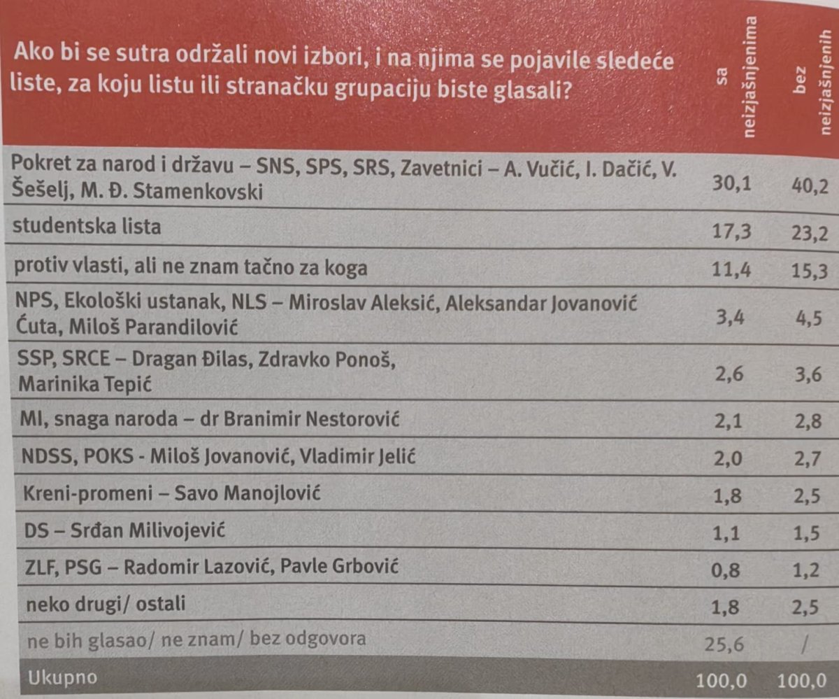 - Na opštem (ukupnom) uzorku podrška vlasti je oko 32-33 odsto, dok je onih koji se izjašnjavaju kao njeni protivnici desetak procenata više (42-43 odsto) uz oko 25 odsto neizjašnjenih. Prezicnije, ako bi se išlo u dve kolone - vlast i kompletna opozicija, 42,10 odsto bi glasalo za ujedinjenu listu opozicije, studenata i građanskih pokreta - navodi nedeljnik Vreme koje je objavilo Vukadinovićevo istraživanje, a preneli ostali tajkunski mediji.
