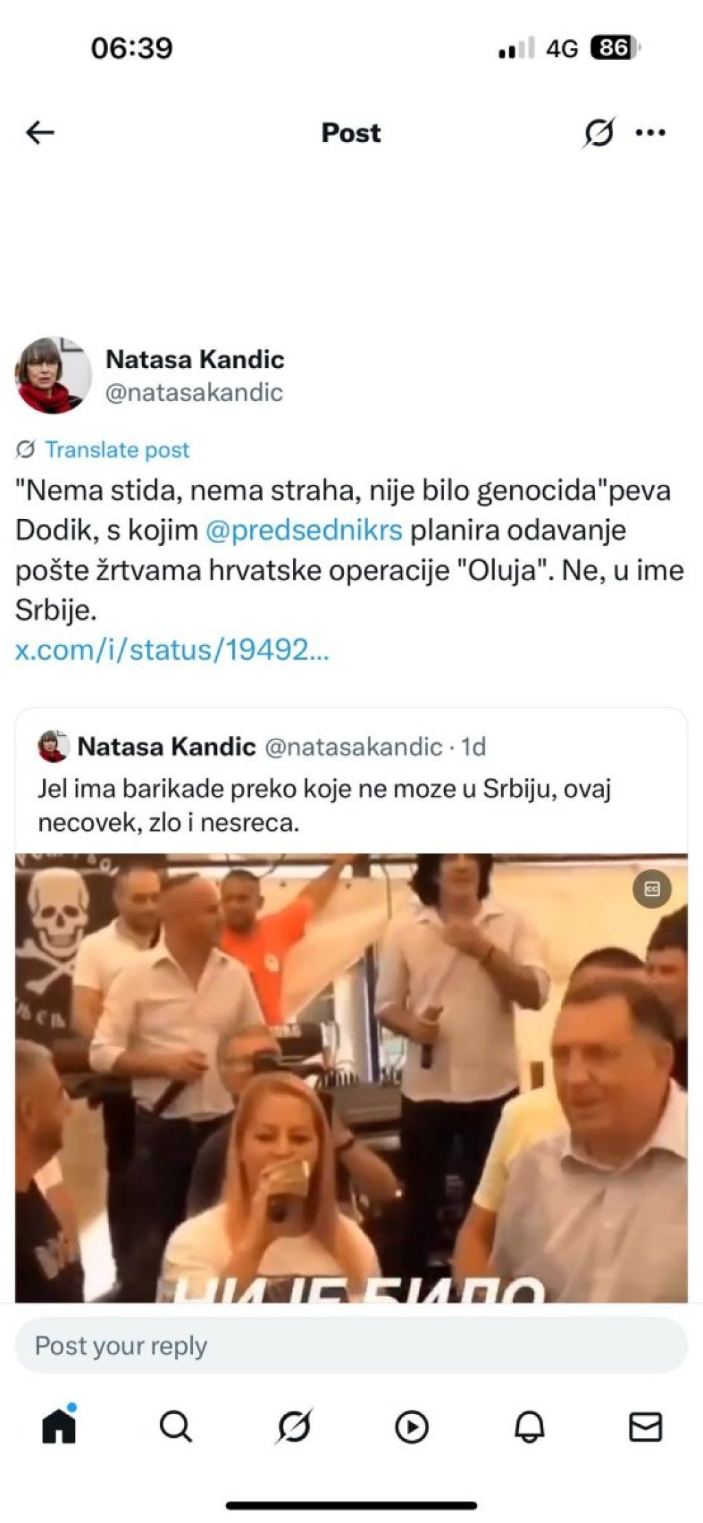 Nataša Kandić, ideološkinja blokadera i okorela antisrpkinja kojoj nije strano da sopstveni narod optužuje za genocid i mnoge druge zločine, sada je pala još niže kritikujući na društvenim mrežama predsednika Republike Srpske Milorada Dodika zbog nedavnog pevanja pesme "Nema stida, nema straha, nije bilo genocida".