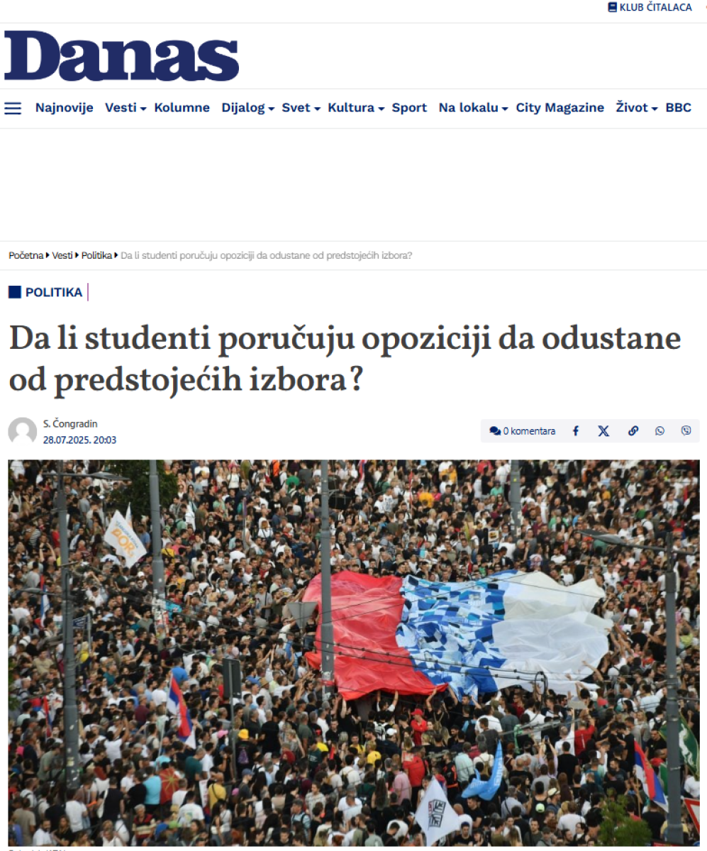 Da između opozicije i blokadera-zgubidana vlada totalni rat svih protiv svih, pokazuje i članak u Danasu koji potpisuje Snežana Čongradin, a koji nosi naslov "Da li studenti poručuju opoziciji da odustane od predstojećih izbora?".