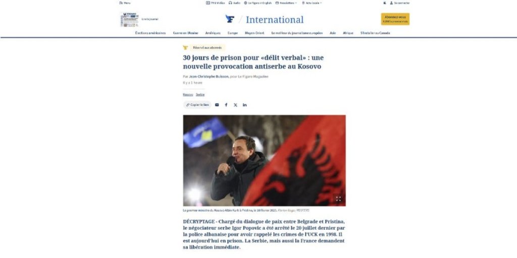 "Zadužen za Dijalog o miru između Beograda i Prištine, član pregovaračkog tima Srbije Igor Popović uhapšen je 20. jula od strane albanske policije zbog toga što je podsetio na zločine OVK iz 1998. godine. On se trenutno nalazi u zatvoru. Srbija, ali i Francuska, zahtevaju njegovo hitno oslobađanje", objašnjava se na početku teksta u kome se potom dodaje: