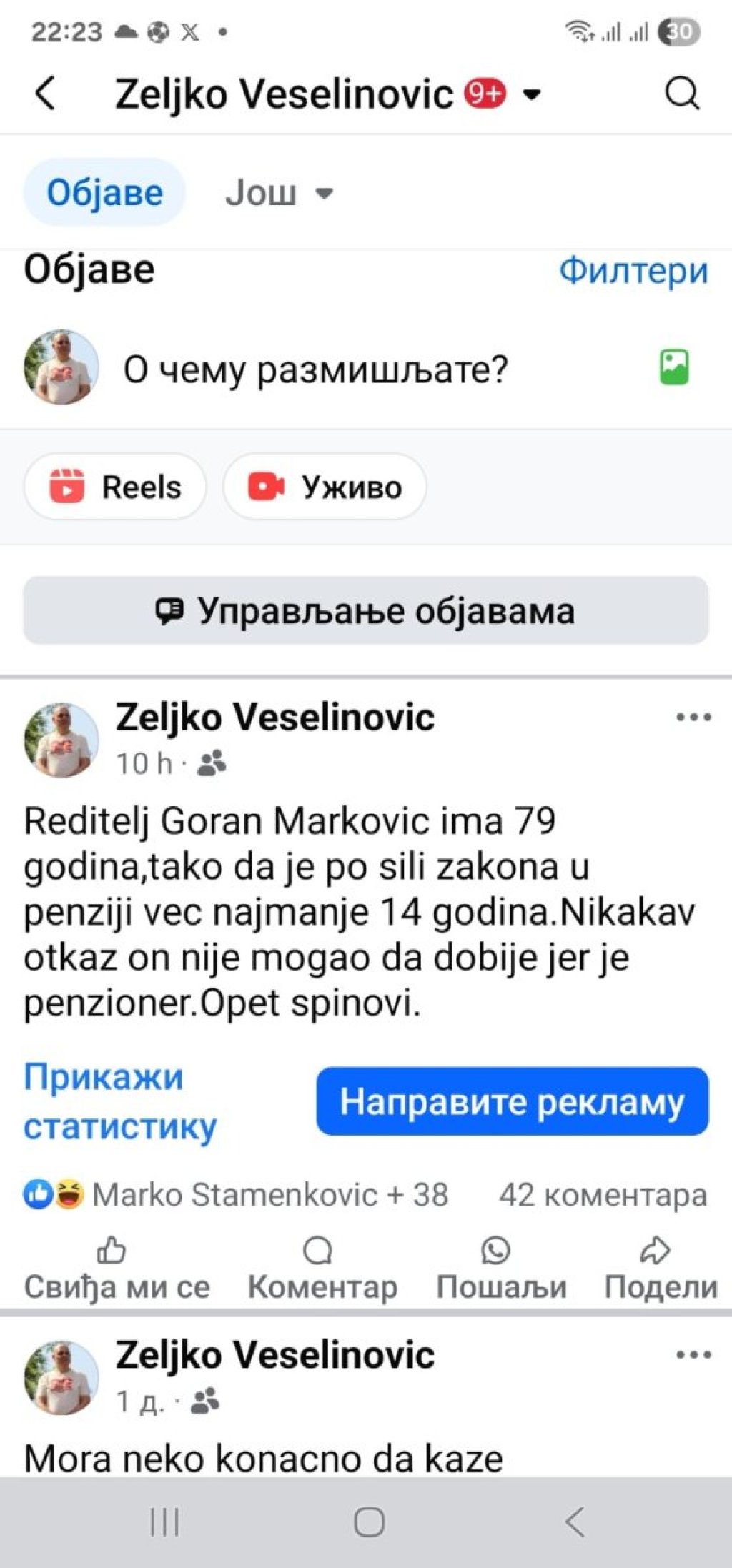 - Reditelj Goran Marković ima 79 godina, tako da je po sili zakona u penziji već najmanje 14 godina. Nikakav otkaz on nije mogao da dobije jer je penzioner. Opet spinovi - zaključio je Veselinović na društvenim mrežama.