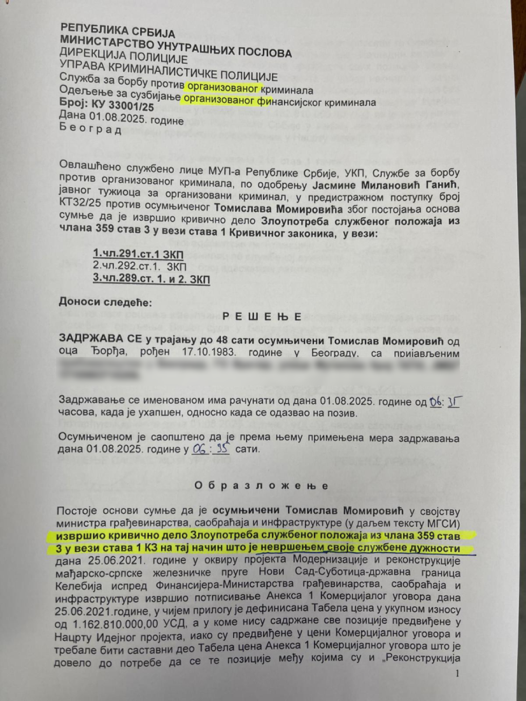 Na ovaj šokantan zaključak upućuje i obrazloženje rešenja kojim se Momiroviću određuje pritvor do 48 sati, a u kom doslovno stoji da se Momiroviću na teret stavlja krivično delo "Zloupotreba službenog položaja".