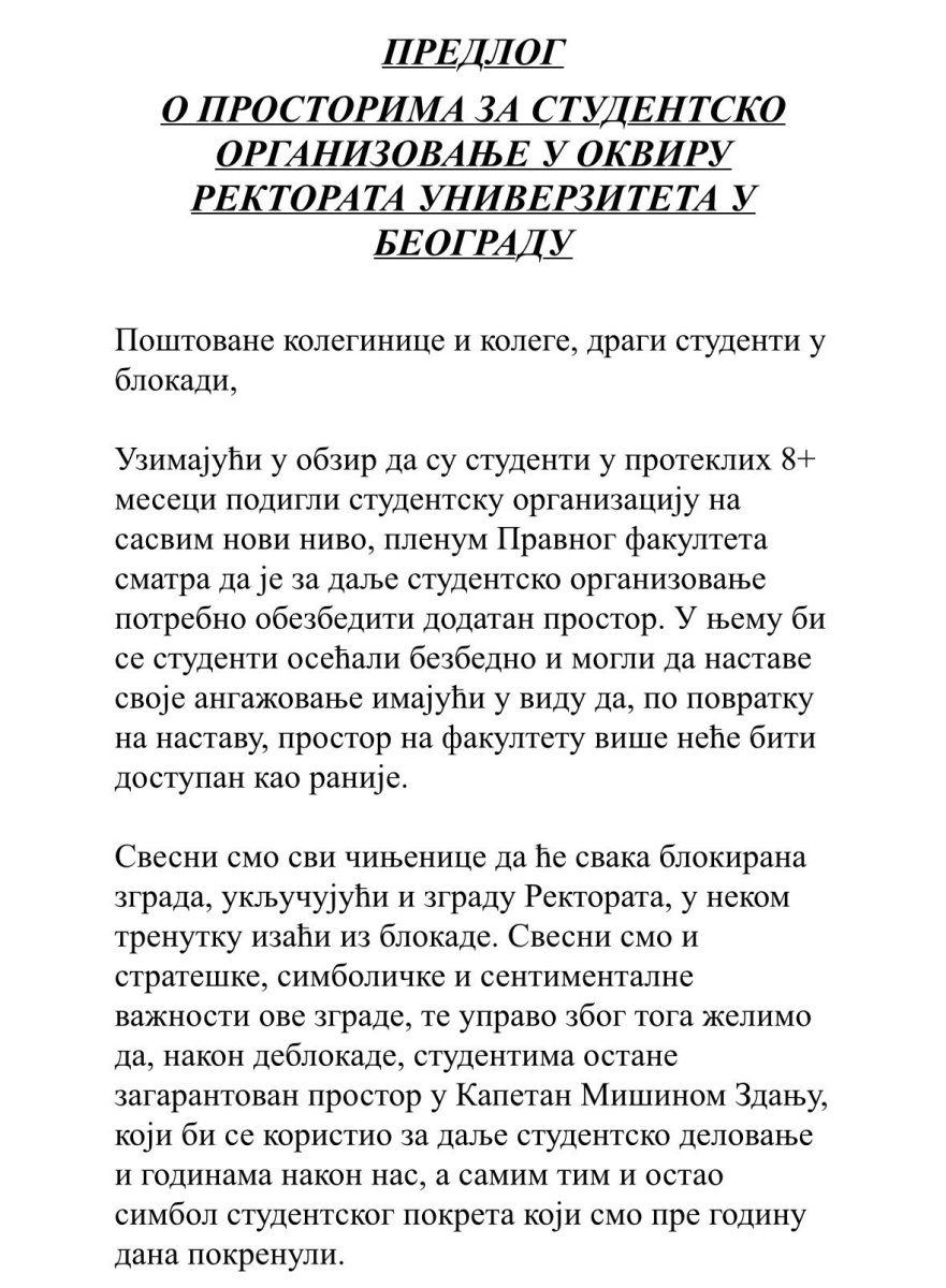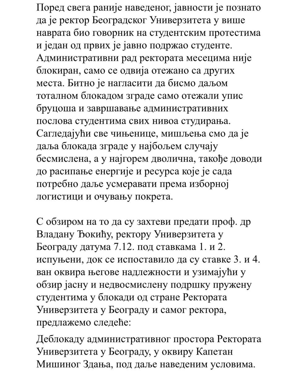 Blokaderi koji su osam meseci uništavali prostorije Beogradskog univerziteta i rektorata sada kada su pukli i kada više blokade ne postoje, traže da im se ustupe sledeće prostorije: