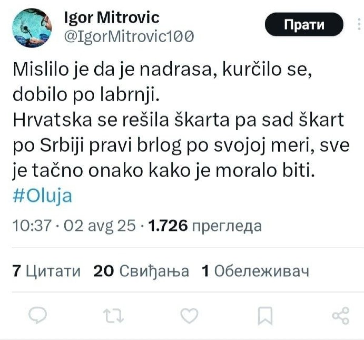 - Mislio je da je nadrasa, kurčilo se, dobilo po labrnji. Hrvatska se rešila škarta pa sad škart po Srbiji pravi brlog po svojoj meri, sve je tačno onako kako je moralo biti - napisao je on na Iksu.