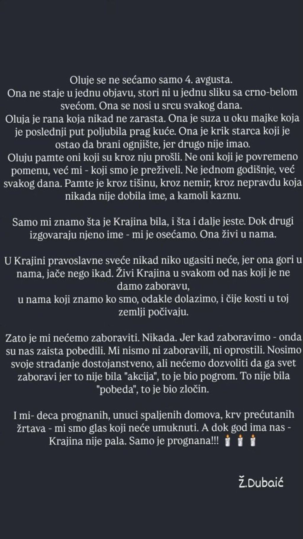 - Oluje se ne sećamo samo 4. avgusta. Ona ne staje u jednu objavu, stori, ni u jednu sliku s crno-belom svećom. Ona se nosi u srcu svakog dana. Oluja je rana koja nikad ne zarasta. Ona je suza u oku majke koja je poslednji put poljubila prag kuće. Ona je krik starca koji je ostao da brani ognjište, jer drugo nije imao. Oluju pamte oni koji su krozu nju prošli. Ne oni koji je povremeno pomenu, već mi - koji smo je preživeli. Ne jednom godišnje, već svakog dana. pamte je kroz tišinu, kroz nemir, kroz nepravdu, koja nikada nije dobila ime, a kamoli kaznu - napisala je, između ostalog, Dubajićeva.