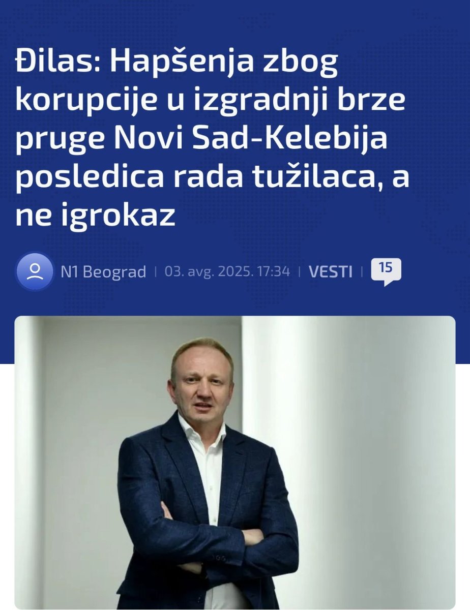 Naime, lider opozicije i predsednik Stranke slobode i pravde Dragan Đilas, izjavio je u svom podkastu "Dežurni krivac" da su "hapšenja u vezi sa korupcijom u projektu izgradnje brze pruge Novi Sad-Kelebija posledica rada troje tužilaca koji su se bavili istragom o tokovima novca u ovom projektu, a ne igrokaz".