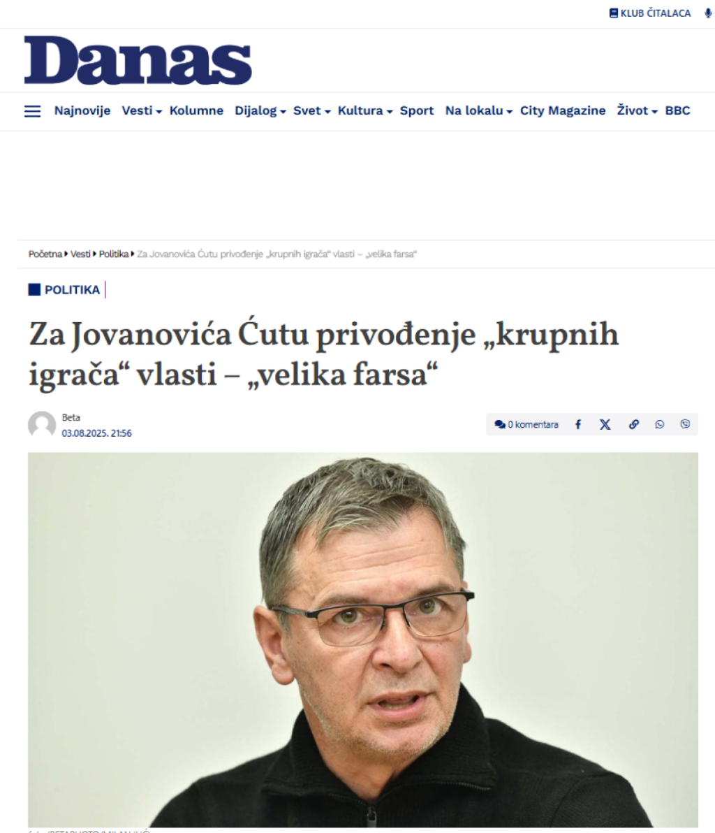 - Sve je to jedna velika farsa da bi se skrenula pažnja sa glavnih tema, a to su litijum, to su protesti, to je i osnovno zahtev da se raspišu izbori - rekao je Jovanović.