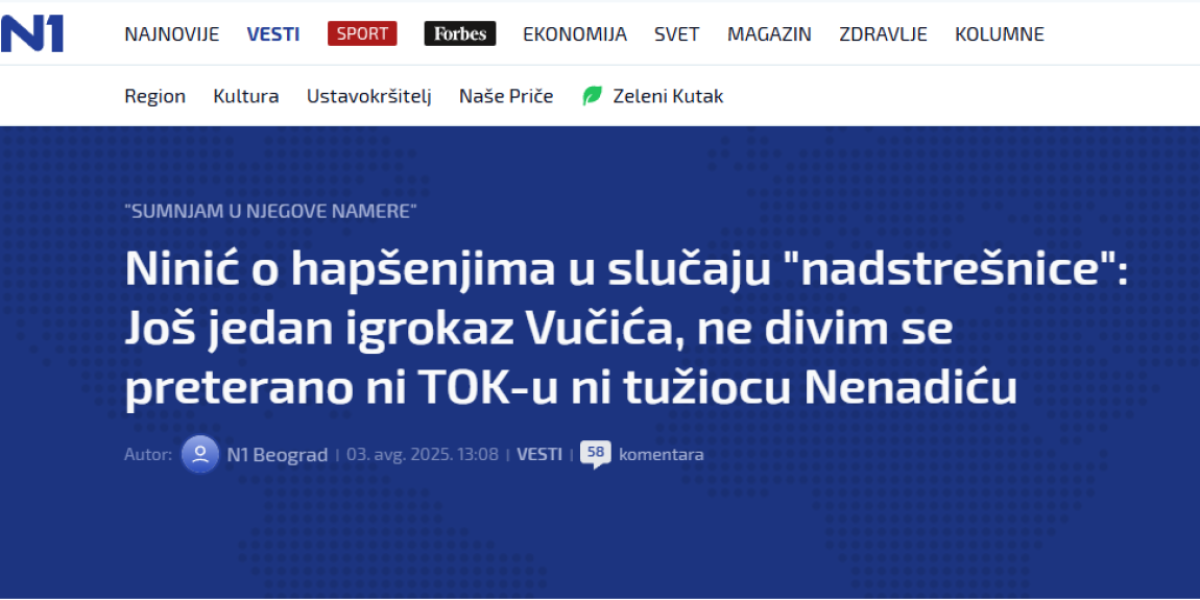 Ana Novaković, novinarka tajkunske televizije N1 izlanula se da je hapšenje bivših ministara Gorana Vesića i Tomislava Momirović kao i njihovih saradnika urađeno da bi se udovoljilo željama blokadera i njihovih medijskih grupa za pritisak.