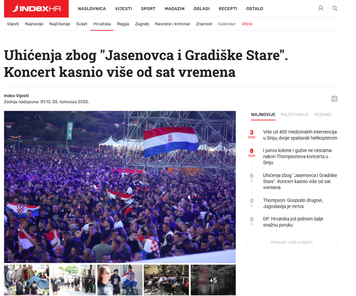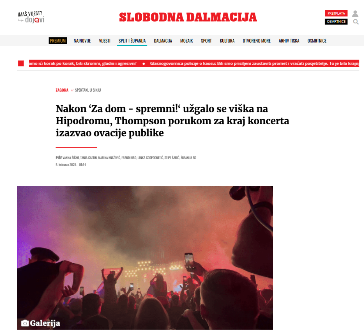 Sa druge stane, u hrvatskim medijima delirijum - Jutarnji list, Index, Slobodna Dalmacija, svi se utrkuju ko će više prostora da posveti Tompsonu, ko će da objavi vest, snimak ili fotografiju više...