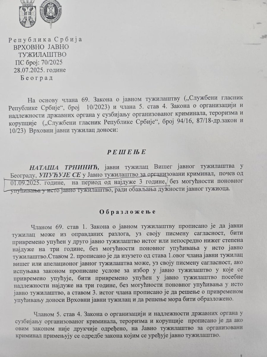 Ovo rešenje (u koje smo imali uvid) donelo je Vrhovno javno tužilaštvo dana 28.07.2025. godine.