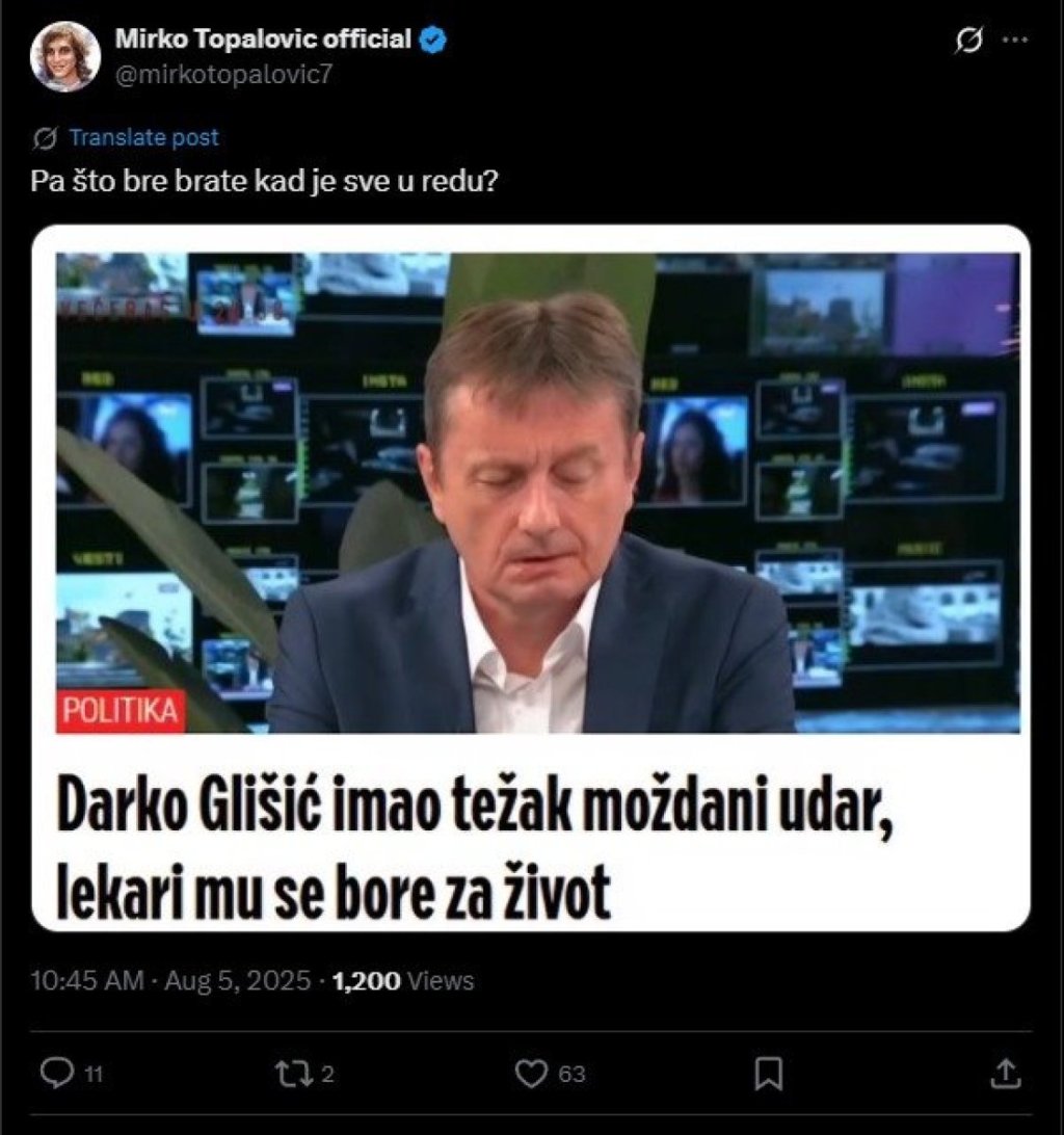 Ministar Darko Glišić je uživo u programu TV Pink doživeo moždani udar, a hejteri i maloumnici iz opozicije seire zbog toga i šalju sramotne i skandalozne poruke.