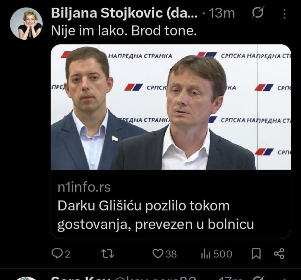 Među prvima koji je dočekao da slavi jer je Darku Glišiću pozlilo je predsednik Demokratske stranke Srđan Milivojević. On je napisao da je "Glišić izgleda u TV prenosu saznao da je sledeći na spisku na hapšenje".