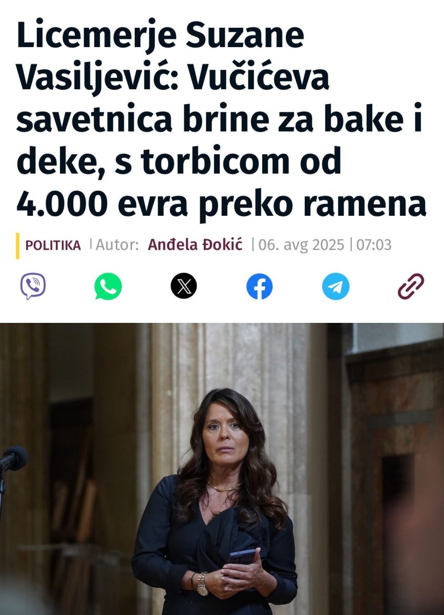 Naime, tajkunska "Nova S" objavila je vest o Suzani Vasiljević pod senzacionalističkim i krajnje sramotnim naslovom: "Vučićeva savetnica brine za bake i deke, s torbicom od 4.000 evra preko ramena".