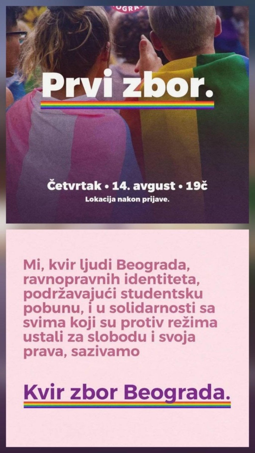 - Mi, kvir ljudi Beograda, ravnopravnih identiteta, podržavajući studentsku pobunu, i u solidarnosti sa svima koji su ustali protiv režima, ustali za slobodu i svoja prava, sazivamo kvir zbor Beograda - piše u njihovoj objavi.