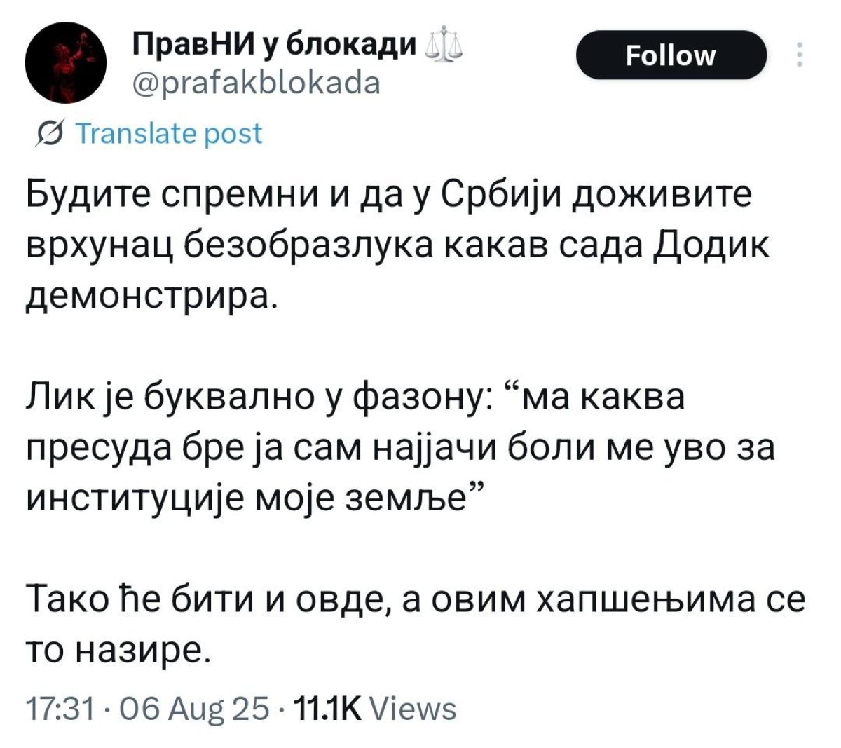 - Budite spremni i da u Srbiji doživite vrhunac bezobrazluka kakav sada Dodik demonstrira. Lik je bukvalno u fazonu: 'ma kakva presuda bre, ja sam najjači, boli me uvo i za institucije moje zemlje.' Tako će biti i ovde, a ovim hapšenjem se to i nazire.