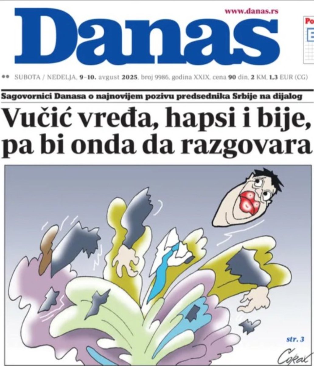 - Skaredno smeće kriminalca Šolaka, već godinama targetira i preti smrću predsedniku Vučiću i članovima njegove porodice, prikazujući ga kao metu za snajper, prikazujući ga obešenog, a evo sada i raskomadanog u eksploziji. Takođe,naslovnica lista "Danas" osim pretnje smrću, predstavlja i pozivanje na terorizam. Možda bi neko tužilaštvo moglo da se probudi i da reaguje na ove divljačke, nehumane, i nezakonite pozive na ubijanje i terorizam lista "Danas".