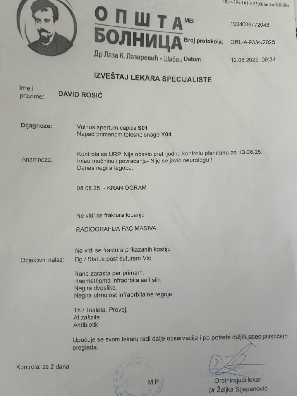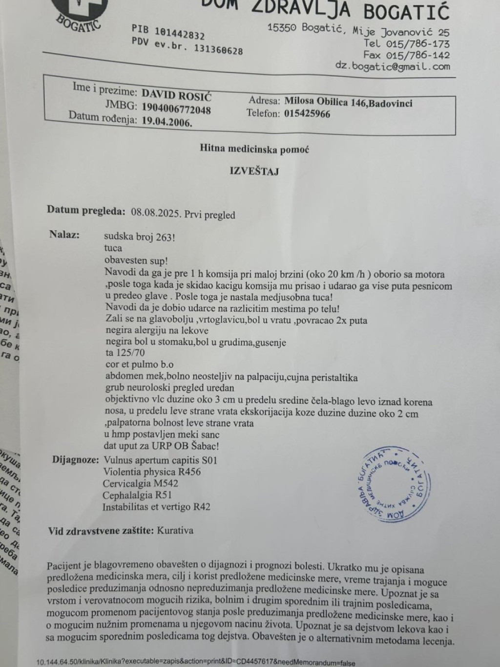 - Krenuo sam motorom ka stricu i u jednom trenutku kod kapije od svog komšije video ženu dotičnog advokata, Novku, kako mi maše nekakvom krpom ili peškirom. Pomislio sam da nešto hoće da me pita, a kako sam je već prošao, okrenuo sam motor u nameri da odem do kuće da odvezem motor i da se peške vratim do komšija da vidim šta je bilo. U tom trenutku je na ulicu izleteo Vilić Zoran, inače moj komšija i Novkin muž koji se zaleteo ka meni. A s obzirom na to da sam se kretao sporo, oko 20, 30 kilometara na sat, odnosno prvom brzinom na motoru, on mi je pritrčao i sa obe ruke me gurnuo. Izgubio sam ravnotežu i pao s motora. Samo što sam uspeo da skinem kacigu on mi je već pritrčao i počeo da me udara po glavi i svuda po telu otvorenim šakama. Branio sam se dok sam ležao na zemlji... Spale su mi papuče, a ispao mi je telefon i razbio mi je sat... Tukao me je jedno sedam, osam minuta i sve vreme ponavljao da sam "ćaci" - počeo je za Informer svoju jezivu priču mladi David Rosić.