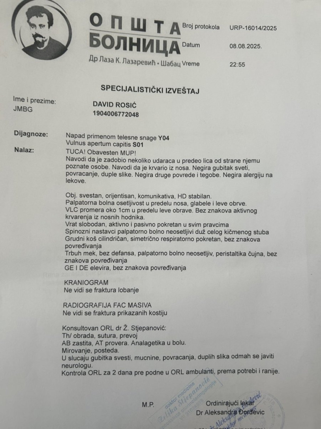 Nasilnik Zoran Vilić iz Bogatića, advokat i član Stranke slobode i pravde (SSP) Dragana Đilasa, mučki je pretukao Davida Rosića, mladića od svega 19 godina, i to samo zato što ne podržava blokadere i ne misli kao on.