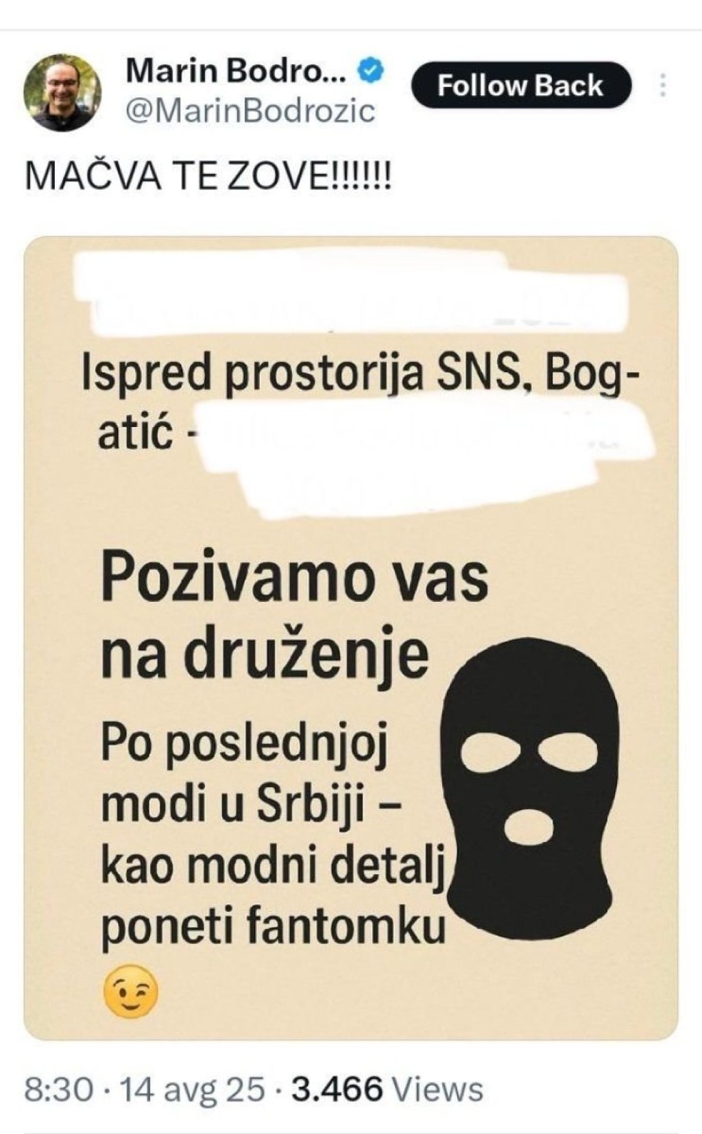 - Pozivamo vas na druženje. Po poslednjoj modi u Srbiji - kao modni detalj poneti fantomku - glasi jeziva poruka blokadera koji okuplja svoje nasilnike u Mačvi.