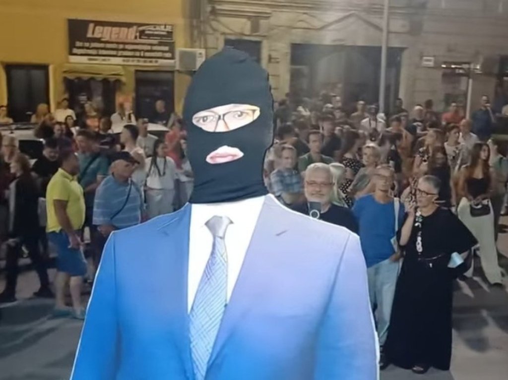 Na ulaz u PU Užice postavili su kartonsku maketu sa likom predsednika Aleksandra Vučića sa fantomkom, a onda su pojedinci stavljali maske na lice. Iz zgrade nije niko izašao, ni ušao.