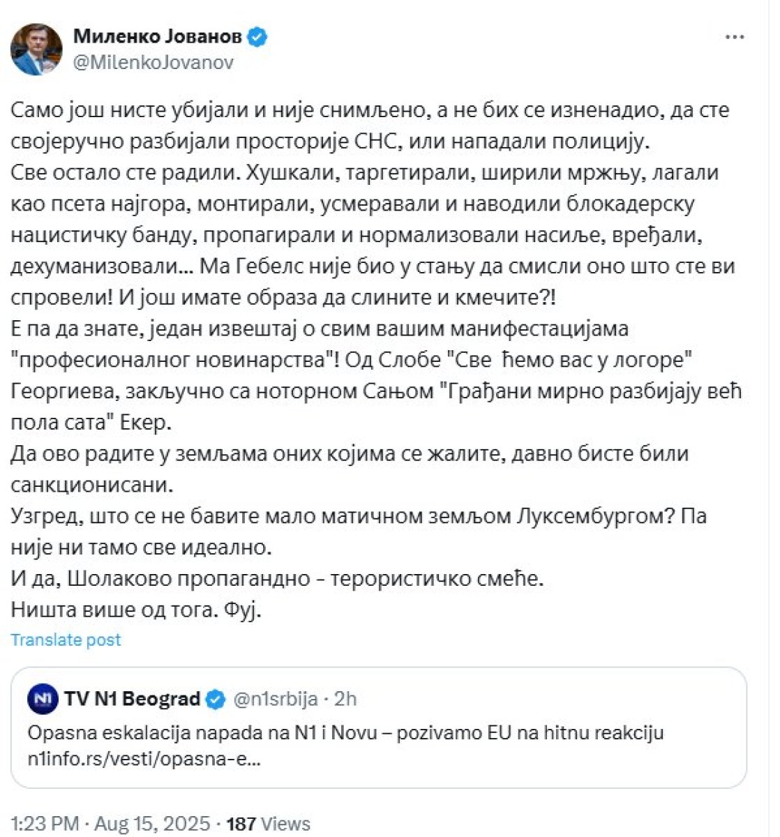 ''Od Slobe "Sve ćemo vas u logore" Georgieva, zaključno sa notornom Sanjom "Građani mirno razbijaju već pola sata" Eker. Da ovo radite u zemljama onih kojima se žalite, davno biste bili sankcionisani. Uzgred, što se ne bavite malo matičnom zemljom Luksemburgom? Pa nije ni tamo sve idealno. I da, Šolakovo propagandno - terorističko smeće. Ništa više od toga. Fuj'', napisao je Jovanov na mreži Iks.