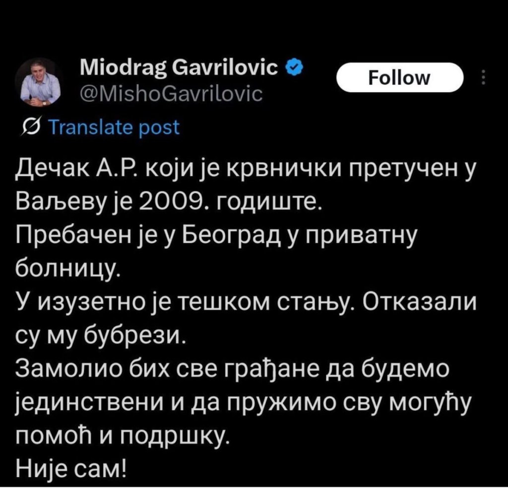 - Dečak A. R, koji je krvnički pretučen u Valjevu je 2009. godište. Prebačen je u Beograd u privatnu bolnicu - napisao je Gavrilović, između ostalog.