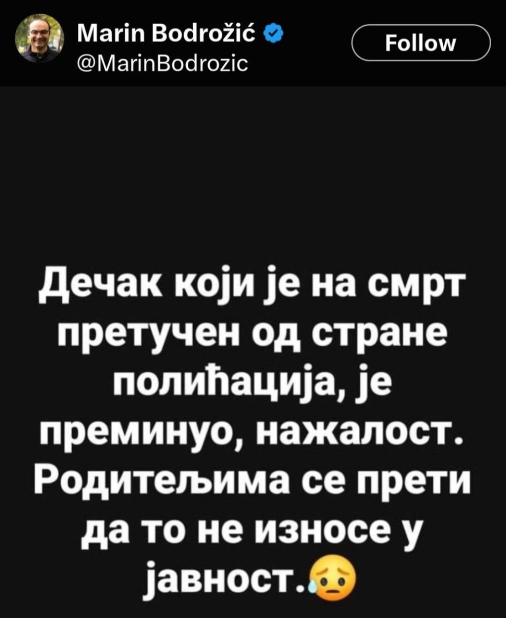 Osim Gavrilovića, iste laži o povređenom dečaku je širio i Marin Bodrožić, s tim što je on čak tvrdio i kako je maloletnik preminuo, ali i da se njegovim roditeljima preti da to ne iznose u javnost.