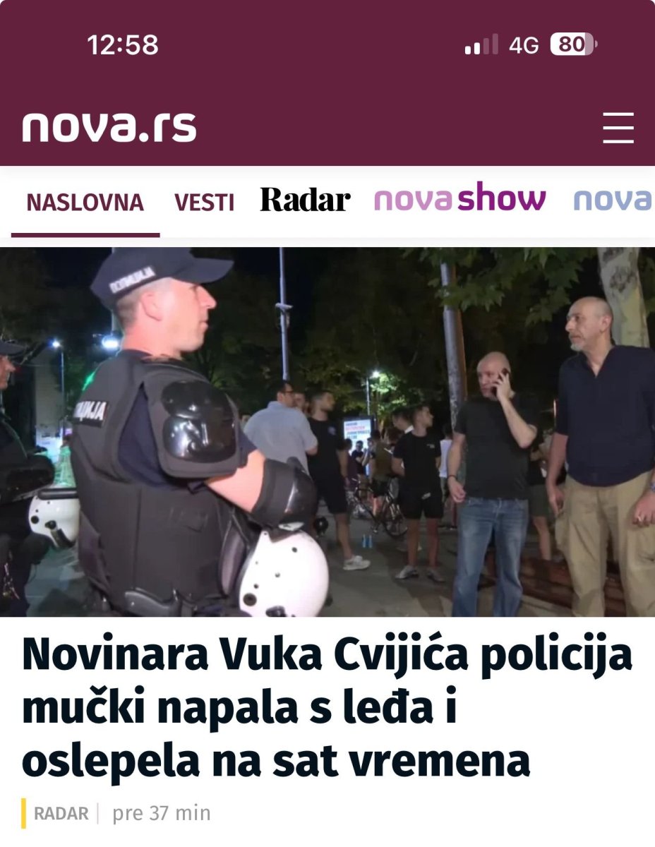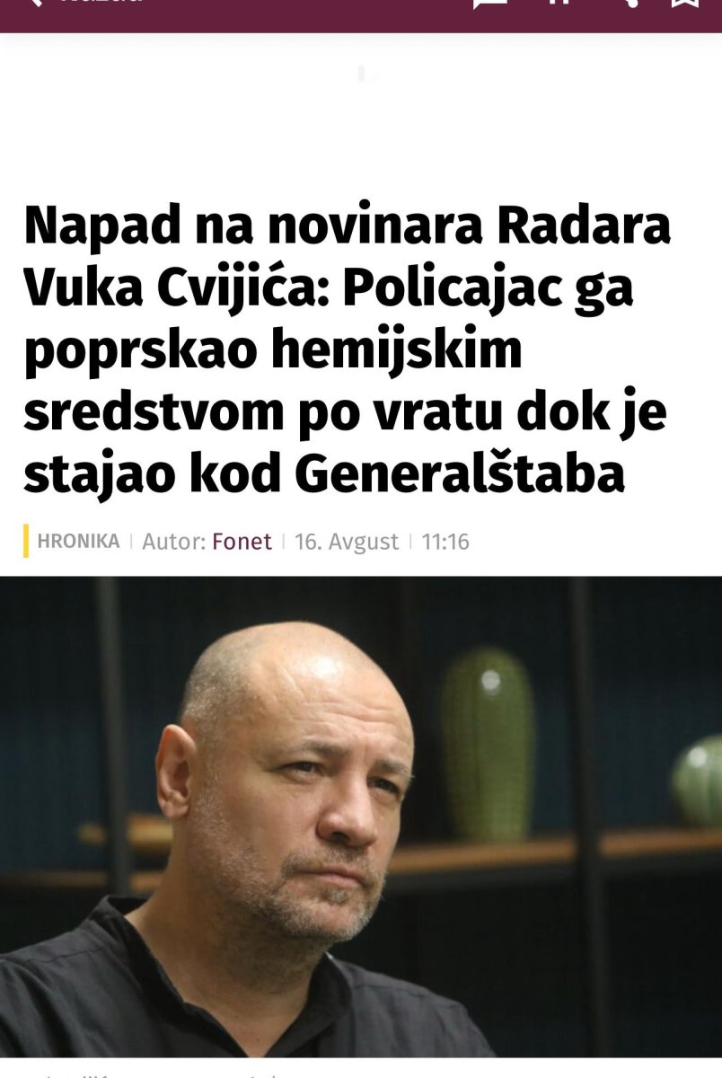 Vuk Cvijić, novinar opozicionog lista Radar, otrčao je u antisrpske medije i zakukao kako ga je policajac na blokadi poprskao hemijskim sredstvom po vratu, a zatim je izjavio da je "oslepeo na sat vremena".