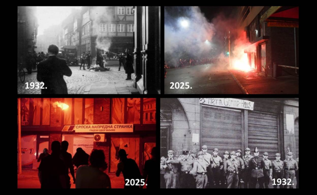 - Napadači blokaderi fašisti su urlali da sve treba pobiti i podmetnuli su požar, u pokušaju da spale sve prisutne. Blokaderi fašisti su sinoć 16.8.2025. po drugi put napali prostorije SNS u Valjevu, koje su ovaj put spalili. Te prostorije se nalaze u novoj stambenoj zgradi. Napadi na ljude i prostorije SNS, pokazuju da se blokaderi ponašaju isto kao nacisti u Nemačkoj tridesetih godina, isto kao ustaše u Hrvatskoj tokom Drugog svetskog rata, isto kao fašisti Ljotićevi zboraši. Da podsetim, opozicija i blokaderi su do sada fizički napali i povredili bar hiljadu ljudi (npr. 2020. su povredili 140 policajaca, u poslednja tri dana su povredili najmanje 300 ljudi, a u poslednjih 9 meseci su povredili stotine ljudi itd.). Podsećam da je pripadnik opozicije i blokader Ivan Mladenović, u Vrnjačkoj Banji, 16.6.2025. ispalio desetak metaka na policajce i izrešetao prostorije SNS, u kojima srećom, nije bilo nikoga - dodao je Nebojša Bakarec.