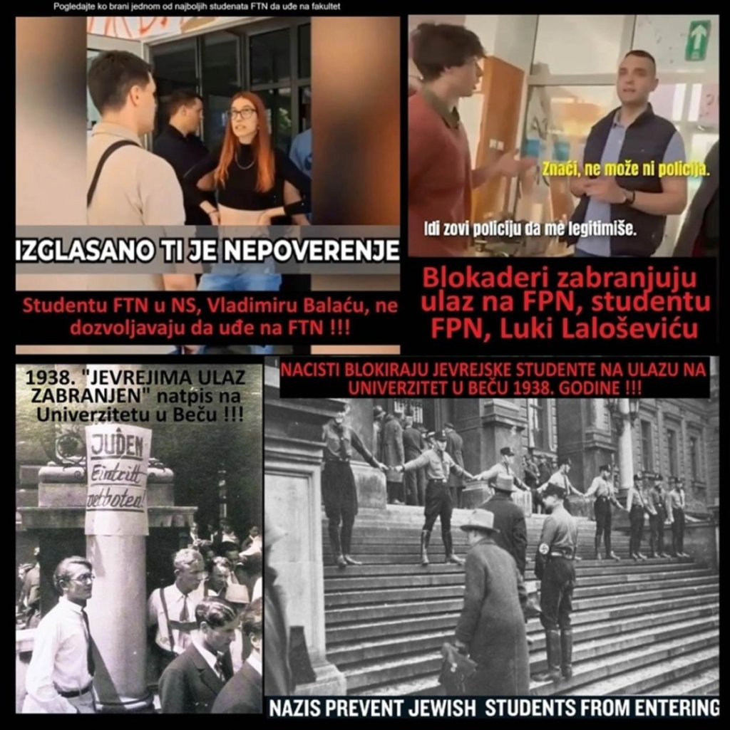 - Blokade fakulteta su izuzetno podsećale na tridesete godine u Nemačkoj i Austriji, u doba nacista, kada su nacisti blokirali fakultete, i zabranili pristup studentima Jevrejima. U junu 2025. su nacisti zboraši blokaderi su organizovali peticiju da se u Srbiji zabrani studiranje, Milošu Pavloviću „Ćaciju“, najboljem studentu Medicinskog fakulteta. Setimo se da su studenti koji žele da uče ("Čaciji"), više puta fizički napadani u Pionirskom parku, i prećeno im je smrću. Studenta Miloša Pavlovića je, na primer, bez povoda, fizički napao funkcioner stranke Kreni promeni, Željko Latas. Primera je bilo na hiljade. Studentu Vladimiru Balaću su blokaderi zabranili da uđe na FTN, a studentu Luki Laloševiću nisu dozvolili da uđe na FPN - podsetio je Bakarec i dodao da su iste takve metode koristili studenti nacisti, tridesetih godina kada su studentima Jevrejima onemogućavali pristup zgradama fakulteta.