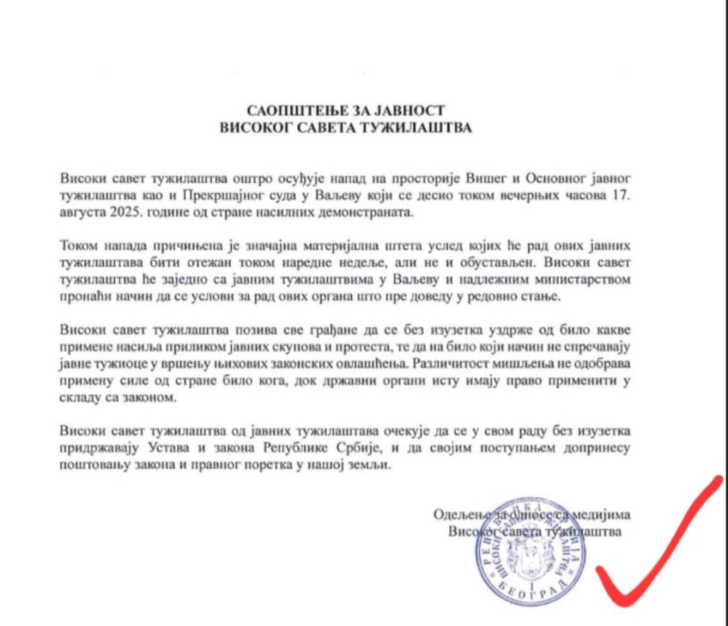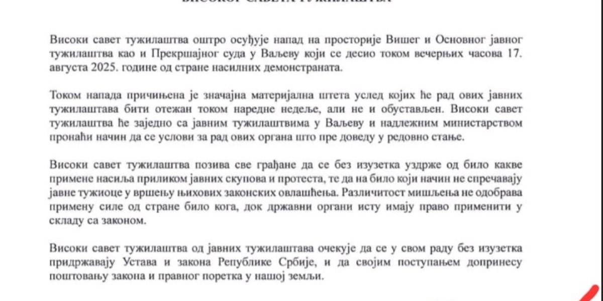 U subotu veče, u Valjevu su napadnute i demolirane prostorije Višeg i Osnovnog javnog tužilaštva,a tim povodom Visoki savet tužilaštva izdao je zvanično saopštenje u kojem osuđuje nasilje i poziva građane na uzdržanost.