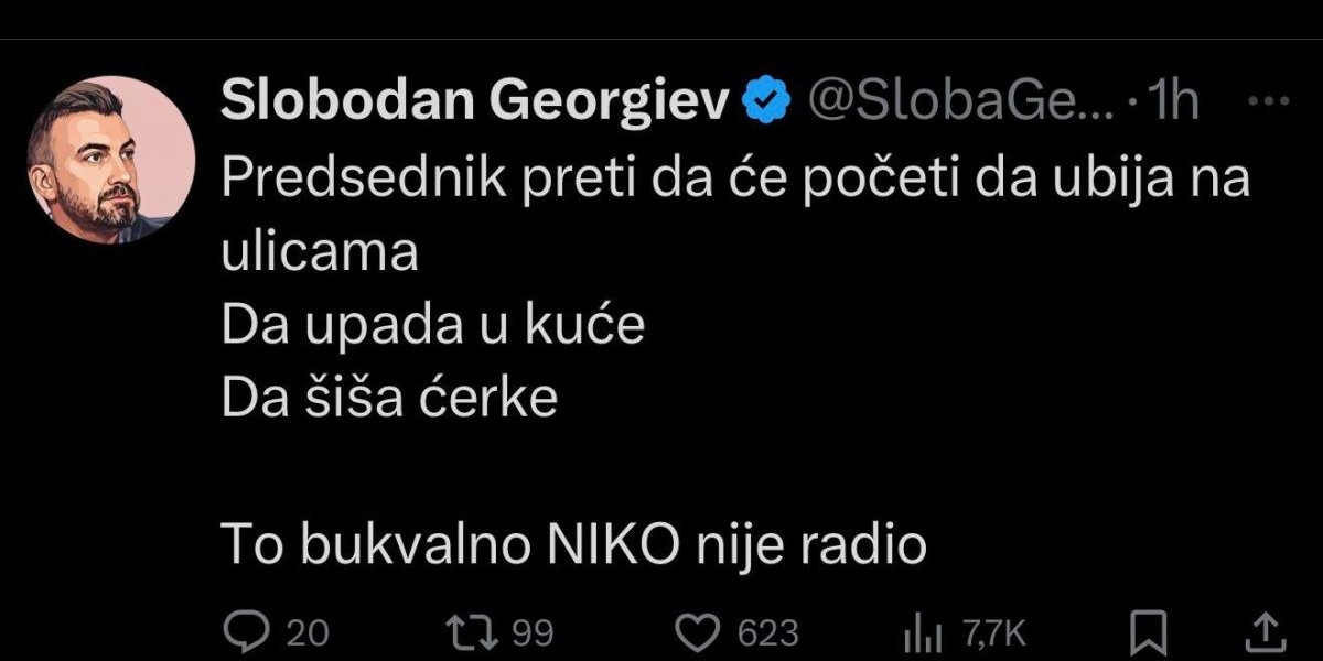 Naime, on je na društvenoj mreži "X" potpuno preokrenuo istinu i naveo da je predsednik Srbije taj koji preti narodu da će politički istomišljenici maltretirati svoj narod, iako je maltretiranje građana zapravo jedino što vidimo poslednjih meseci.