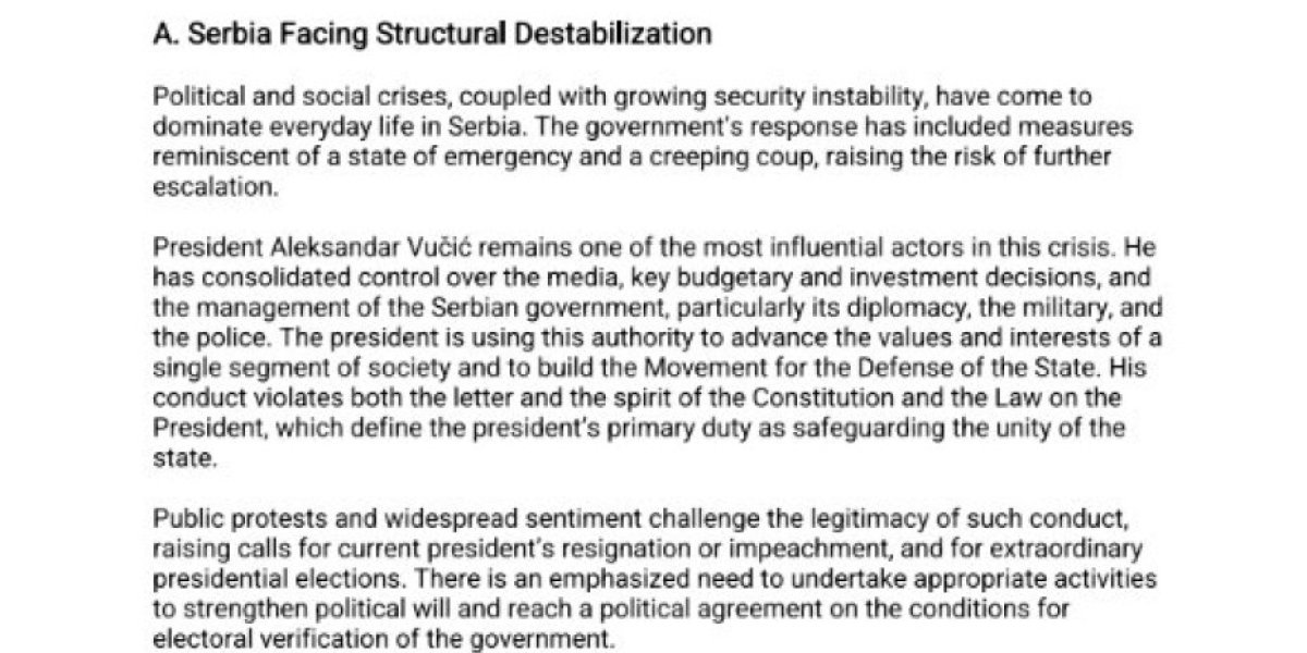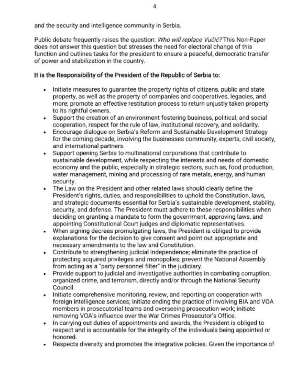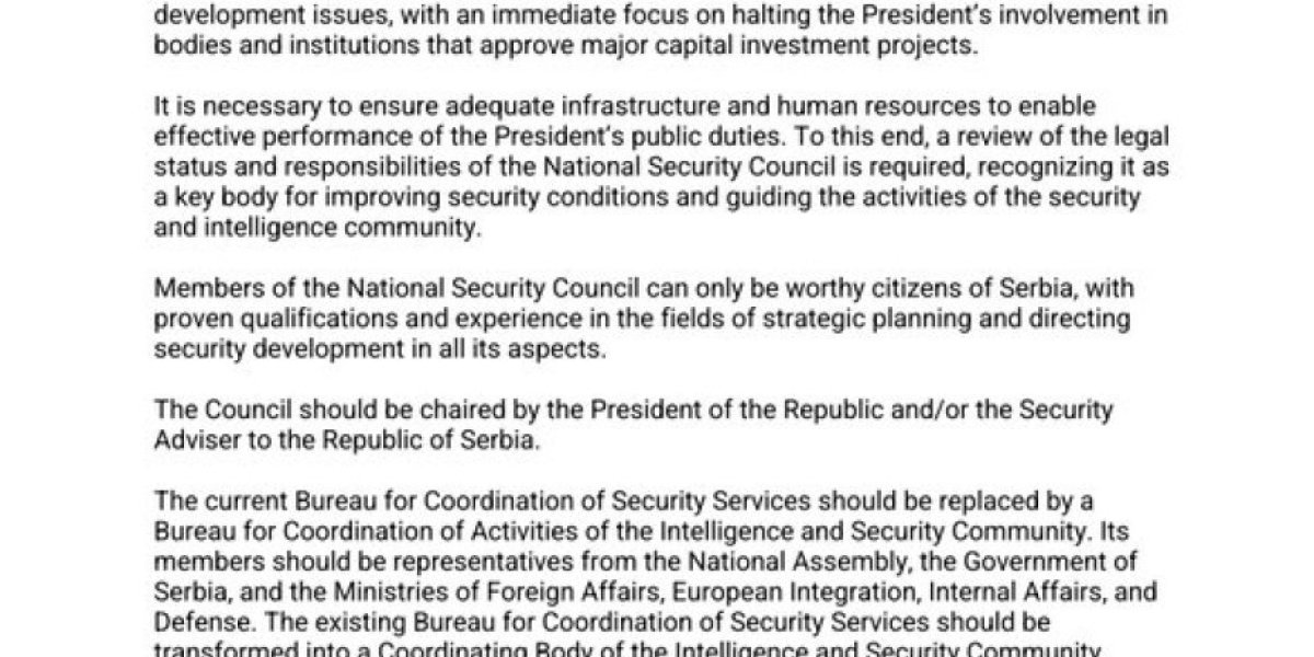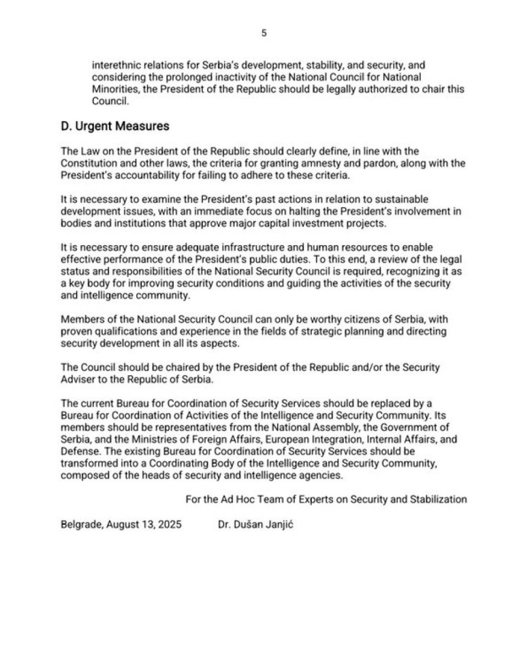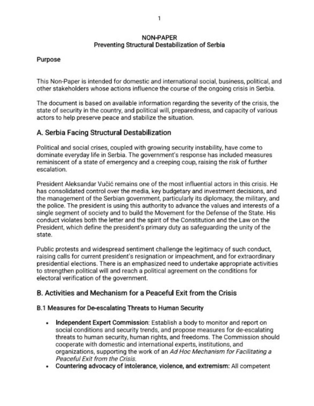 "Zbog ozbiljnih bezbednosnih izazova, poseban fokus je na ulozi predsednika, Saveta za nacionalnu bezbednost i bezbednosno-obaveštajnih službi. Ne pitanje "ko će zameniti Vučića - već kako omogućiti demokratsku smenu i miran prenos vlasti", piše u non pejperu koji je Dušan Janjić poslao 13. avgusta, a koji je kako je naveo - namenjen domaćim i međunarodnim društvenim, poslovnim, političkim i drugim akterima čije aktivnosti utiču na tok aktuelne krize u Srbiji.