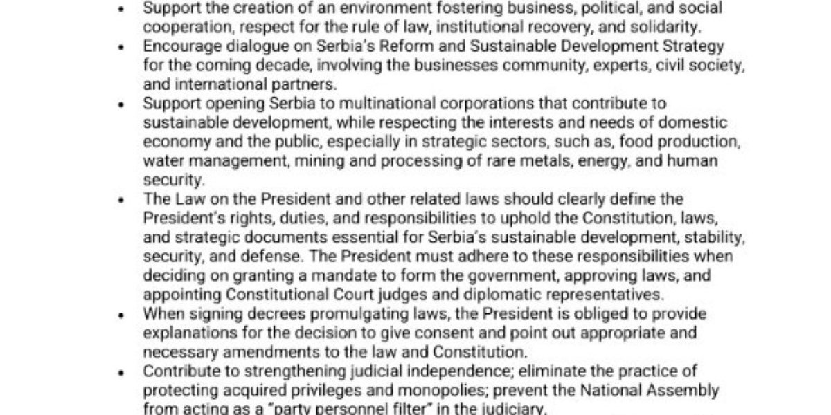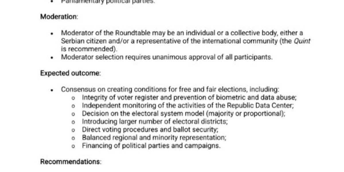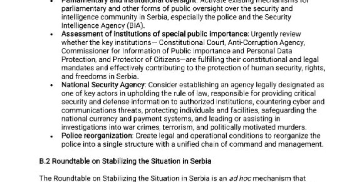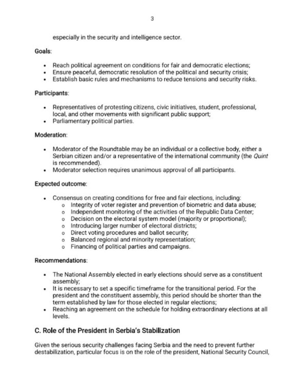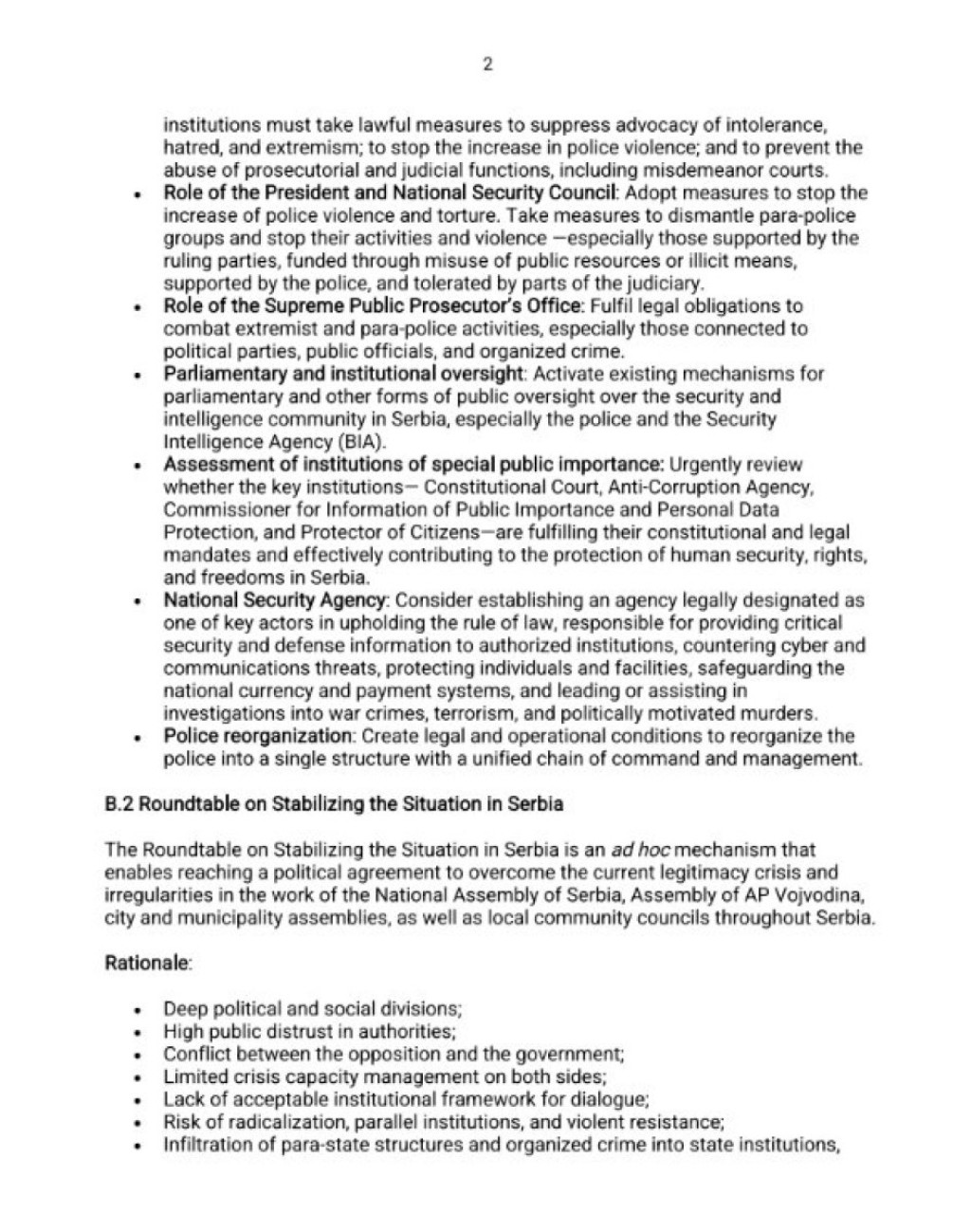 On takođe predlaže neke "Ad hoc mehanizme za postizanje političkog dogovora", okrugli sto za stabilizaciju situacije u Srbiji itd. Pored toga, u dokumentu se predlažu nerealne i neustavne izmene uloga institucija - uključujući ulogu predsednika, tužilaštva, BIA, Saveta za bezbednost i drugih - bez legitimiteta, bez podrške građana i izvan postojećih zakonskih procedura.
