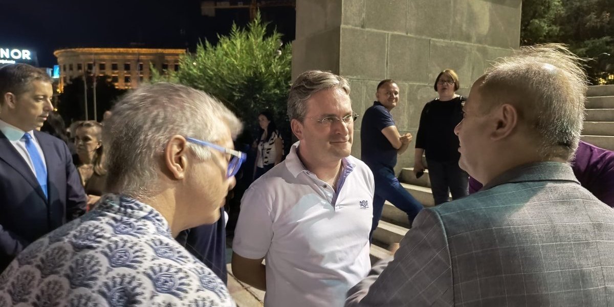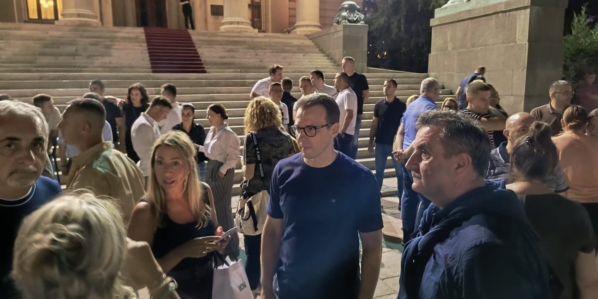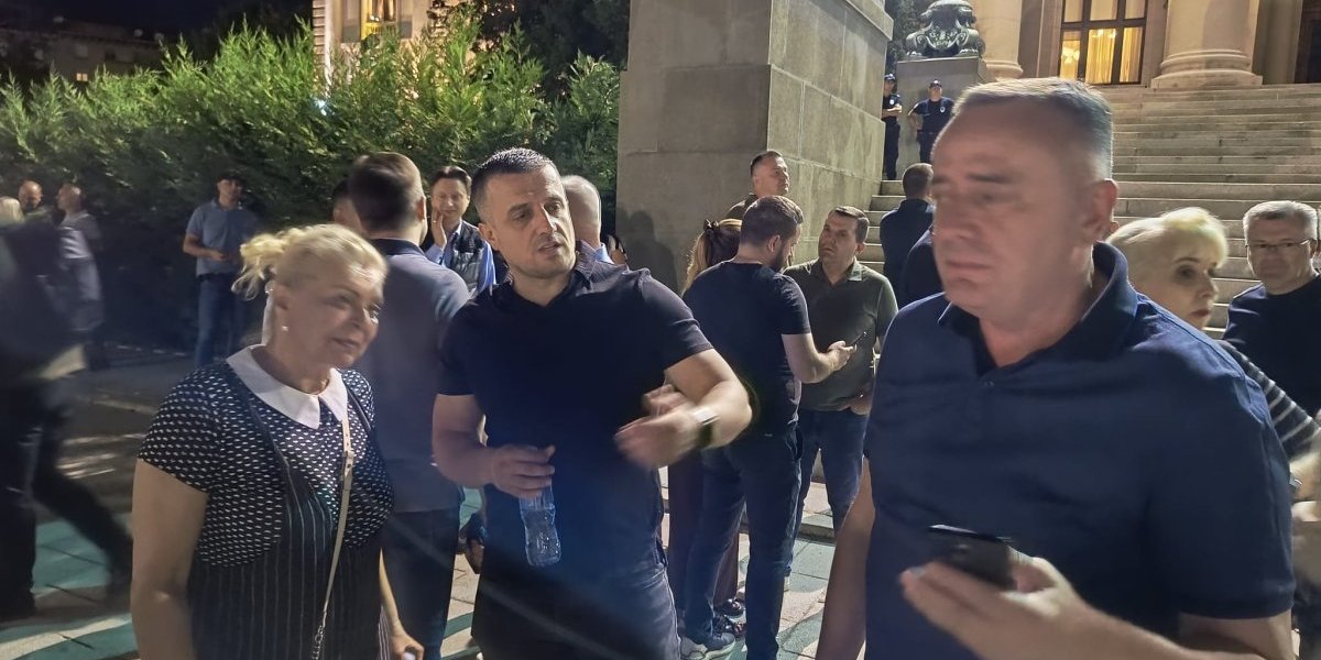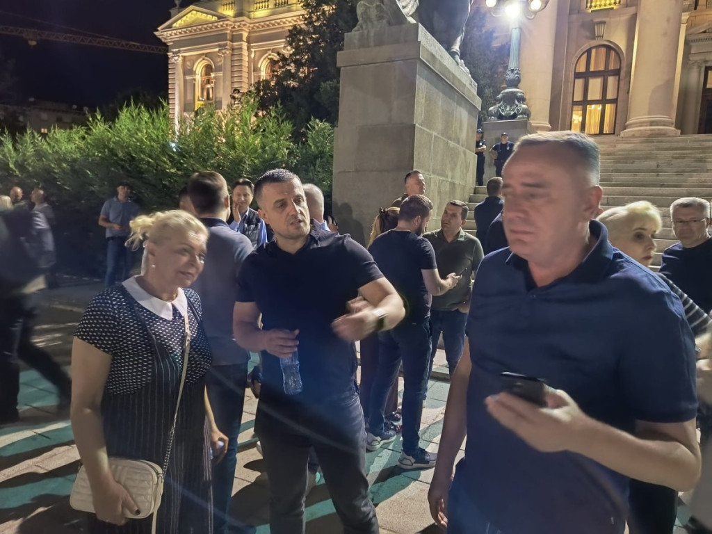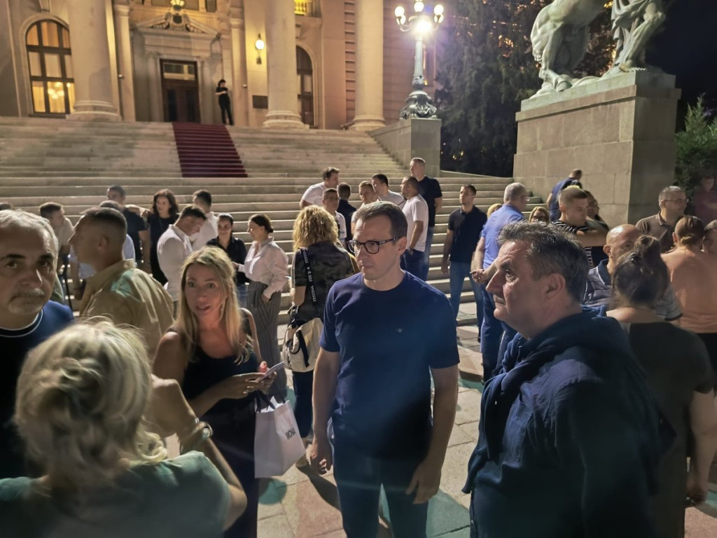Kako se može videti po snimcima sa lica mesta, ispred Narodne skupštine su ministri Siniša Mali, Nikola Selaković, Adrijana Mesarović, Marko Đurić, Aleksandar Antić, Petar Petković i drugi.