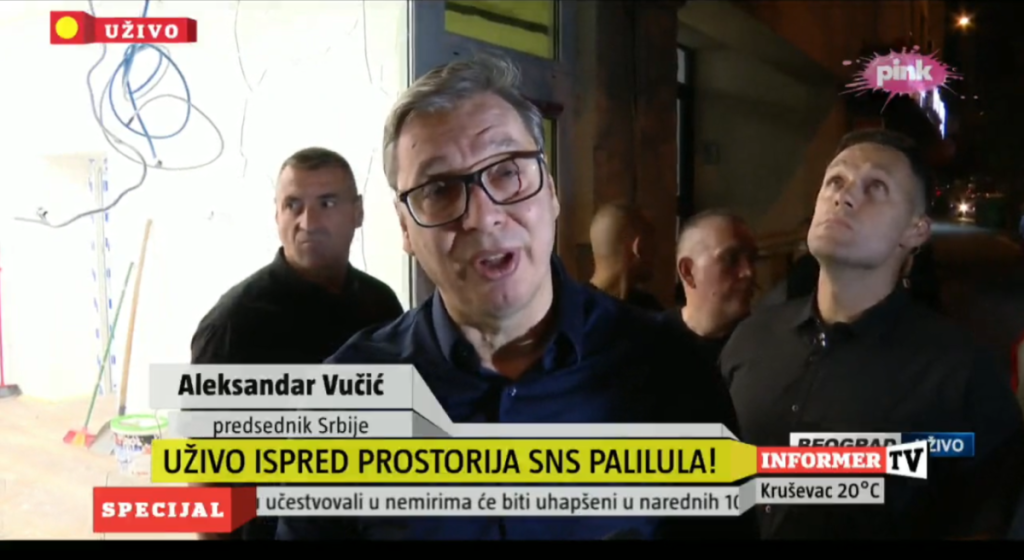 Oni su, tokom šetnje kroz Cvijićevu ulicu, zastali kod prostorija SNS i počeli da ih demoliraju. Bacali su kamenje i koristili pirotehnička sredstva, dominantno topovske udare, ponovivši na taj način scenario iz Valjeva od pre dva dana. Blokaderi nasilnici su počeli prvo da se povlače, a zatim se kreću ka kordonu policije. Na ulici je i vozilo za razbijanje demonstracija. Blokaderi su prevrtali i kontejnere.