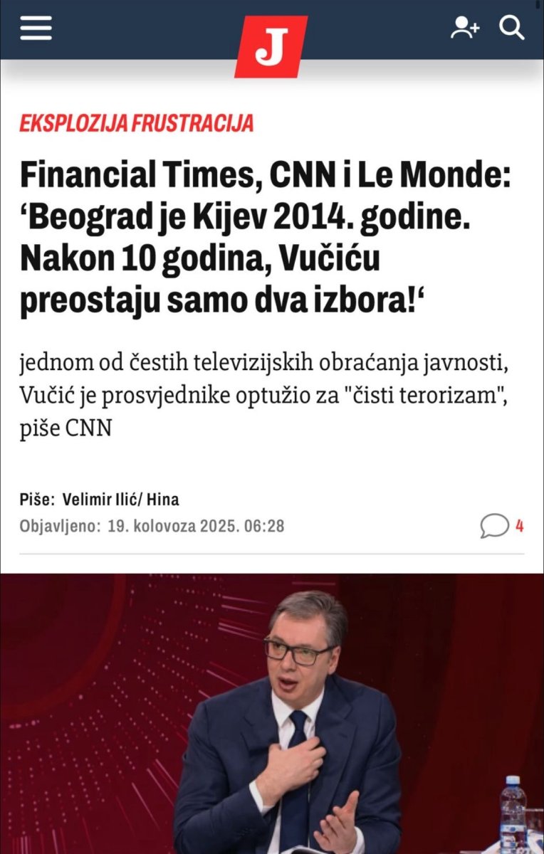 - Financial Times, CNN i Le Monde: 'Beograd je Kijev 2014. godine. Nakon 10 godina, Vučiću preostaju samo dva izbora! - glasi naslov sramnog teksta.