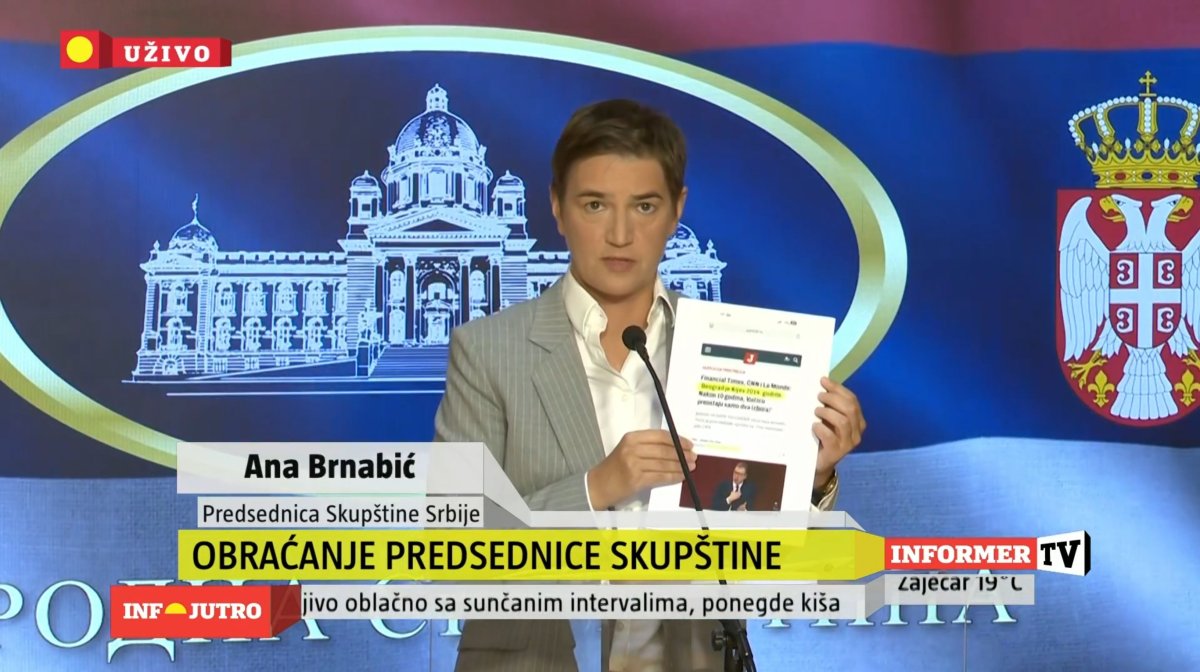 - Naš odgovor, to kažem kao predsednica Narodne skupštine, je ne! Poruka strancima je i ne pomišljajte da pričate dalje o ovakvim non pejperima. U Beogradu i Srbiji neće biti novog Majdana. Borićemo se svim demokratskim sredstvima, pružaćemo otpor na svakom mestu. Demokratski, ljudski, iz srca i ljubavi prema našoj Srbiji. Ne terorom i nasiljem kako bi to oni voleli. Neće ovde biti bratoubilačkog rata. Borićemo se i podsećanjem na rezultate, i planovima za budućnost. Ni ne pomišljajte. Ali hvala Srđi Popoviću, hrvatskim medijima, Dušanu Janjiću i ad hok timu eksperata, što su pokazali i dokazali da je ovo bio pokušaj obojene revolucije - zaključila je Ana Brnabić.