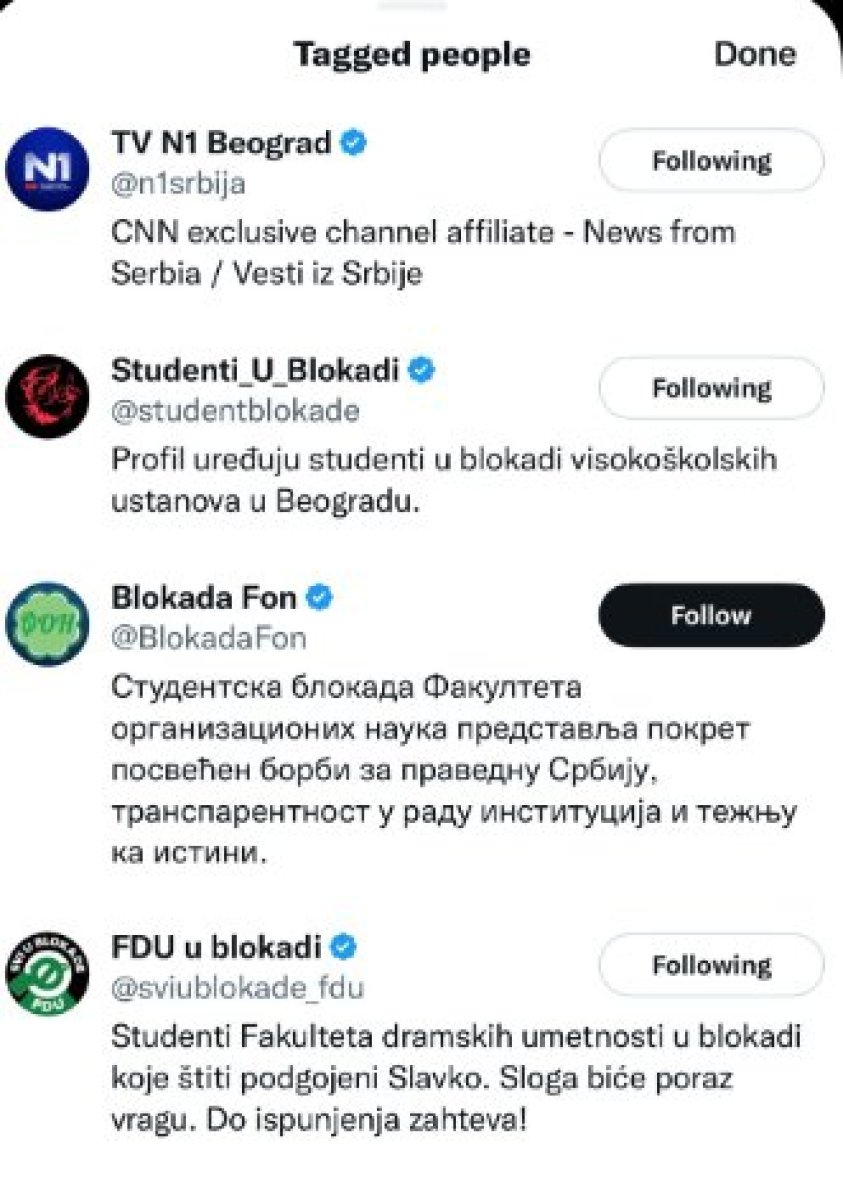 Ne samo da su se na ovaj način strani potpaljivači Srbije obrukali, već su pokazali i koja fabrika zla stoji iza svega i ko je dao materijal za ovu blamažu. Tagujući među studentima u blokadi i N1, razotkrili su sve.