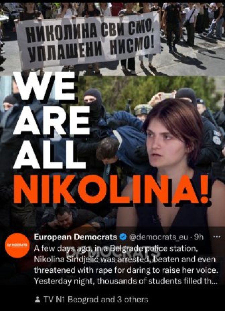 Dakle, narode, Evropske demokrate uputile su podršku blokaderki Nikolini Sinđelić i objavile fotografiju "da svet vidi" represiju srpske policije, a na fotografiju stavili šiptarske ROSU jedinice i torturu kroz koju je prošao naš ministar.