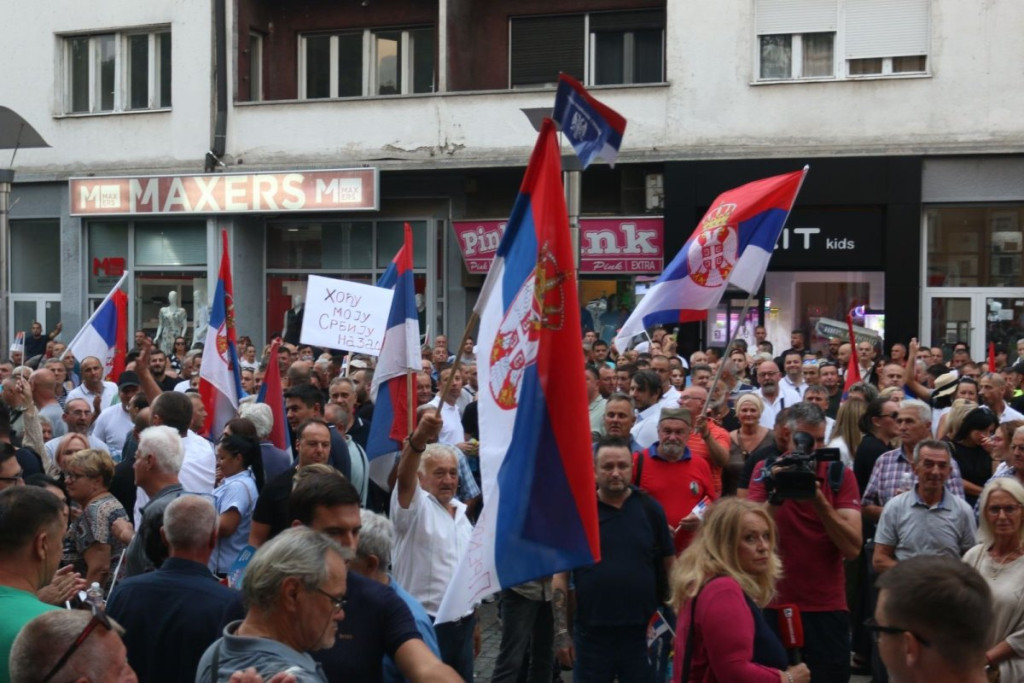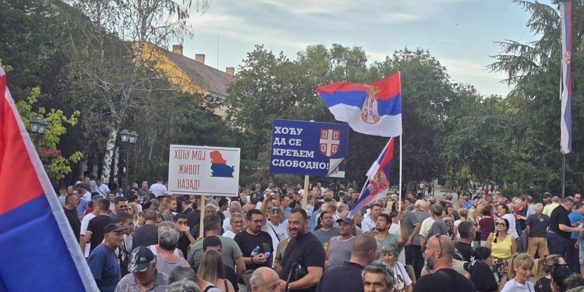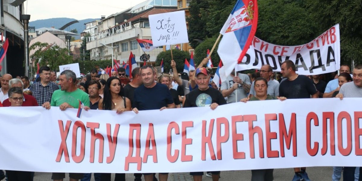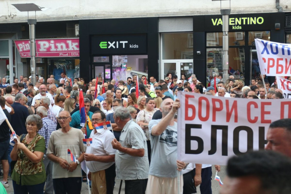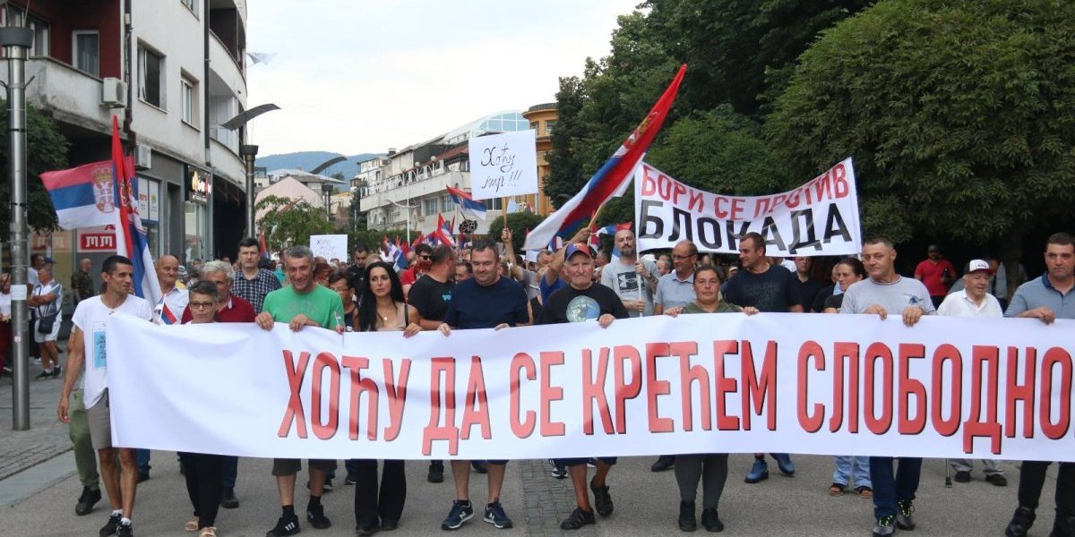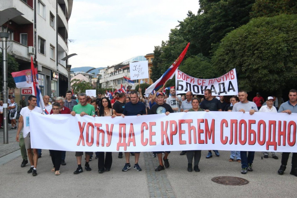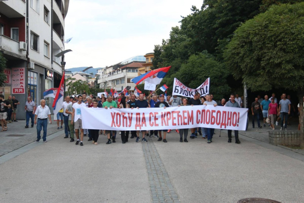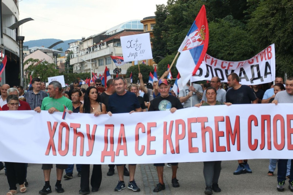 Okupljeni građani nose transparente “Hoću da se krećem slobodno”, “Hoću da radim” i “Borba protiv blokada”.