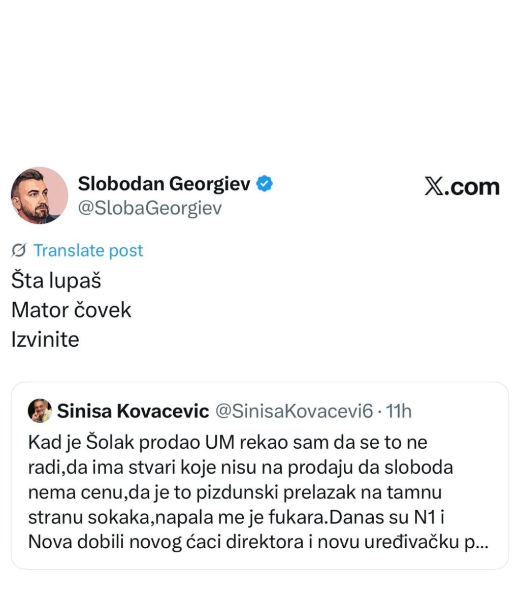 Ideolozi obojene revolucije posvađali su se zbog novog direktora Junajted medije, odnosno zbog prodaje te firme. Nakon što je Kovačević naglasio da je od starta bio protiv prodaje, Geogriev mu je odgovorio uvredama.