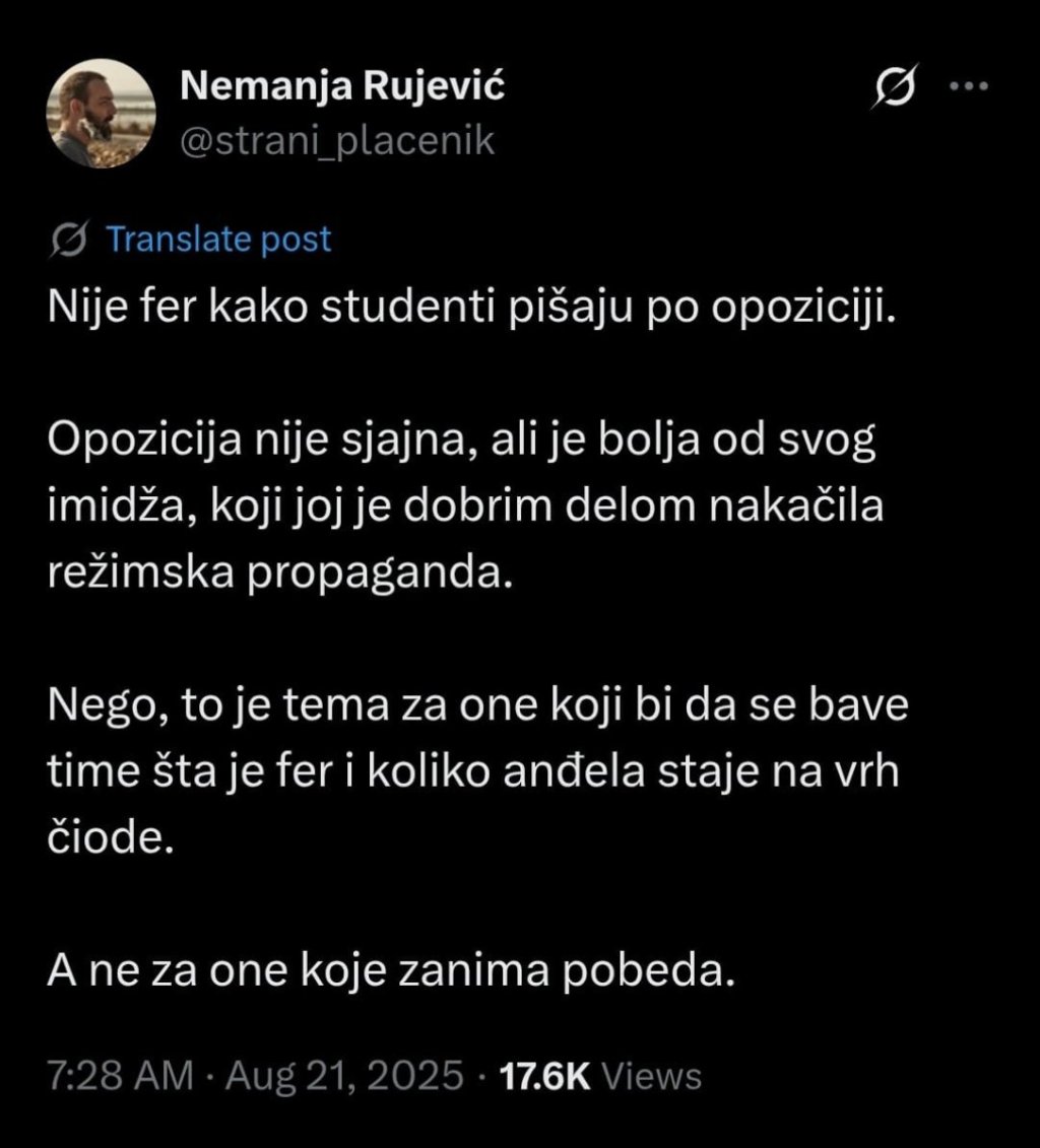 - Nije fer kako studenti pišaju po opoziciji. Opozicija nije sjajna, ali je bolja od svog imidža, koji joj je dobrim delom nakačila režimska propaganda. Nego, to je tema za one koji bi da se bave time šta je fer i koliko anđela staje na vrh čiode. A ne za one koje zanima pobeda - piše Nemanja Rujević.