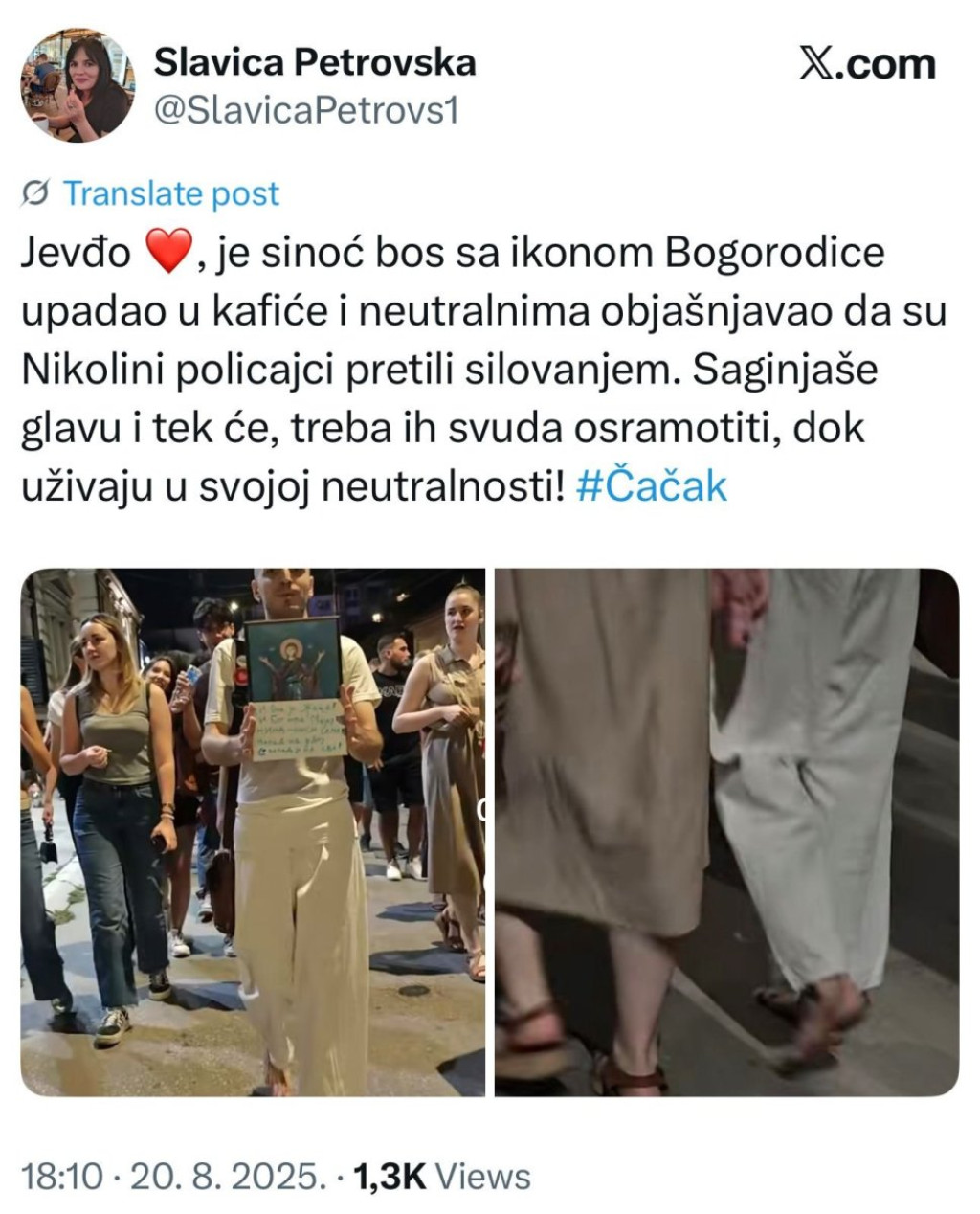 Ludi Jevđenije je sinoć maltretirao ljude po kafićima, upadao u objekte sa ikonom Bogorodice i širio laži o napadu policije na Nikolinu Sinđelić, poznatiju kao štićenica Mikija Aleksića.