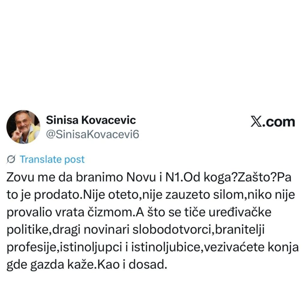 - Zovu me da branimo Novu i N1. Od koga? Zašto? Pa to je prodato. Nije oteto, nije zauzeto silom, niko nije provalio vrata čizmom - napisao je Kovačević.