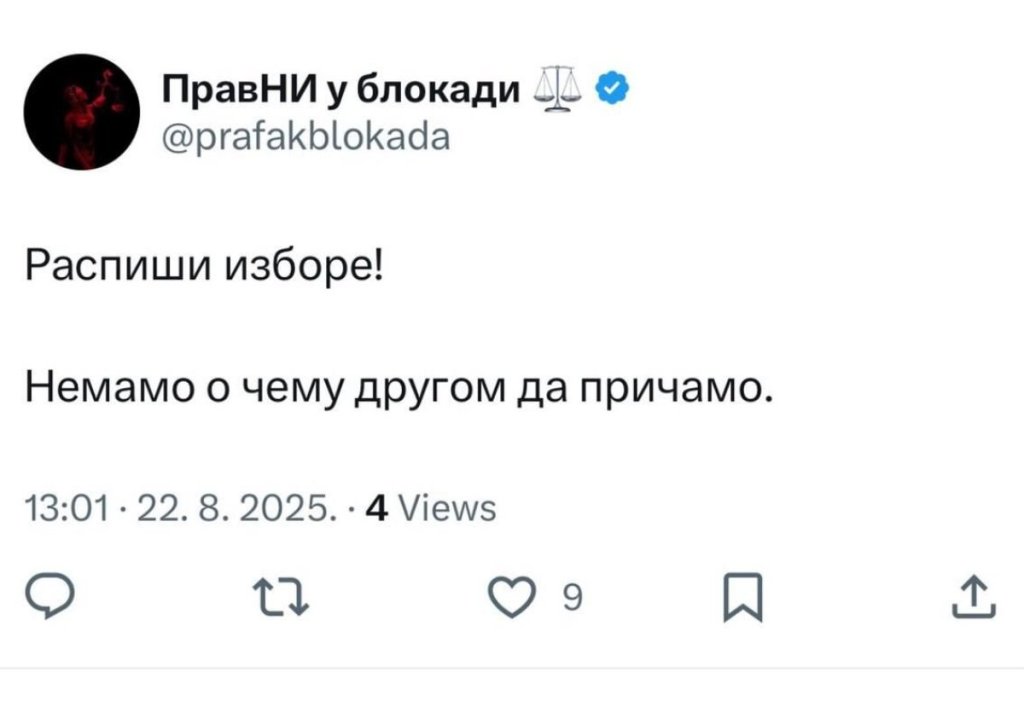 - Raspiši izbore. Nemamo o čemu drugom da pričamo - navodi se na društvenoj mreži Iks sa profila "Pravni u blokadi".