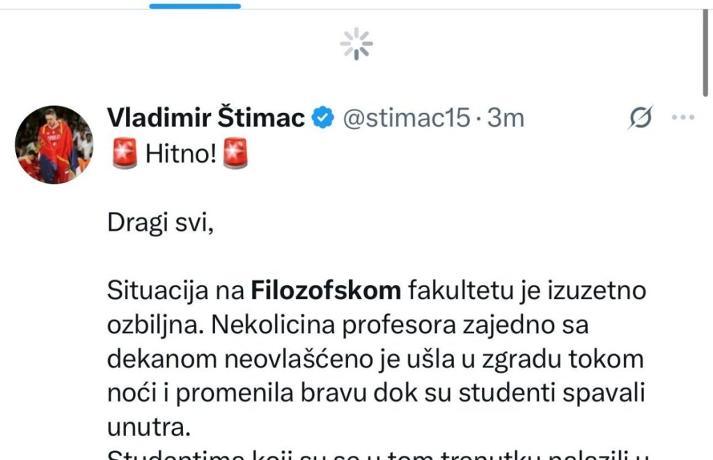 - Dragi svi, situacija na Filozofskom fakultetu je izuzetno ozbiljna. Nekolicina porofesora je zajedno sa dekanom neovlašćeno ušla u zgradui tokom noći i promenila bravu dok su studenti spavali unutra - napisao je Štimac na mreži Iks.