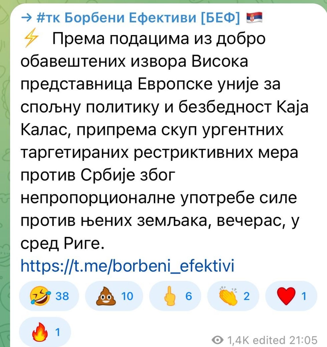 - Prema podacima iz dobro obaveštenih izvora visoka predstavnica Evropske unije za spoljnu politiku i bezbednost Kaja Kalas, priprema skup urgentnih targetiranih restriktivnih mera protiv Srbije zbog neproporcionalne upotrebe sile protiv njenih zemljaka, večeras, usred Rige - stoji u sarkastičnom postu.