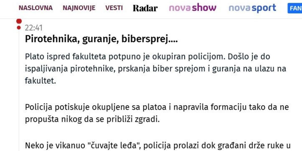 - Većinom su u pitanju funkcioneri političkih stranaka, aktivisti i članovi zborova, koji pokušavaju nasilnim putem da iz zgrade isteraju dekana i upravu fakulteta. Apelujem na organizatore protesta da se uzdrže od nasilja i napada na visokoškolsku ustanovu, kao i napada na policiju. Fakultet nije mesto za nasilne akcije. Mir i dijalog nemaju alternativu.